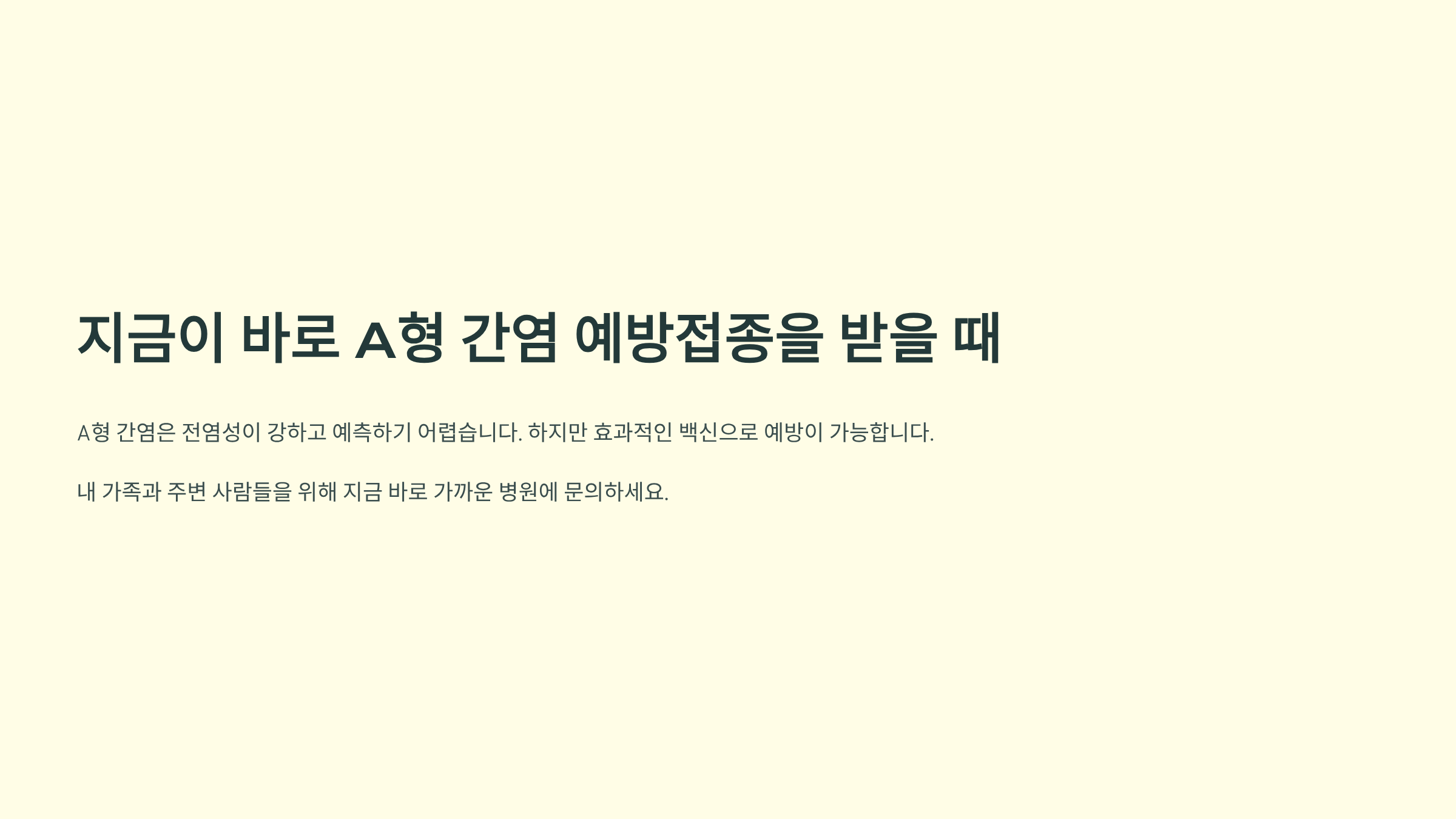 여러분의 건강을 지키는 가장 확실한 방법은 바로 A형 간염 예방접종입니다. 내 가족과 주변 사람들을 위해서라도 지금 당장 가까운 병원에 문의해서 접종 일정을 잡아보시는 건 어떨까요?