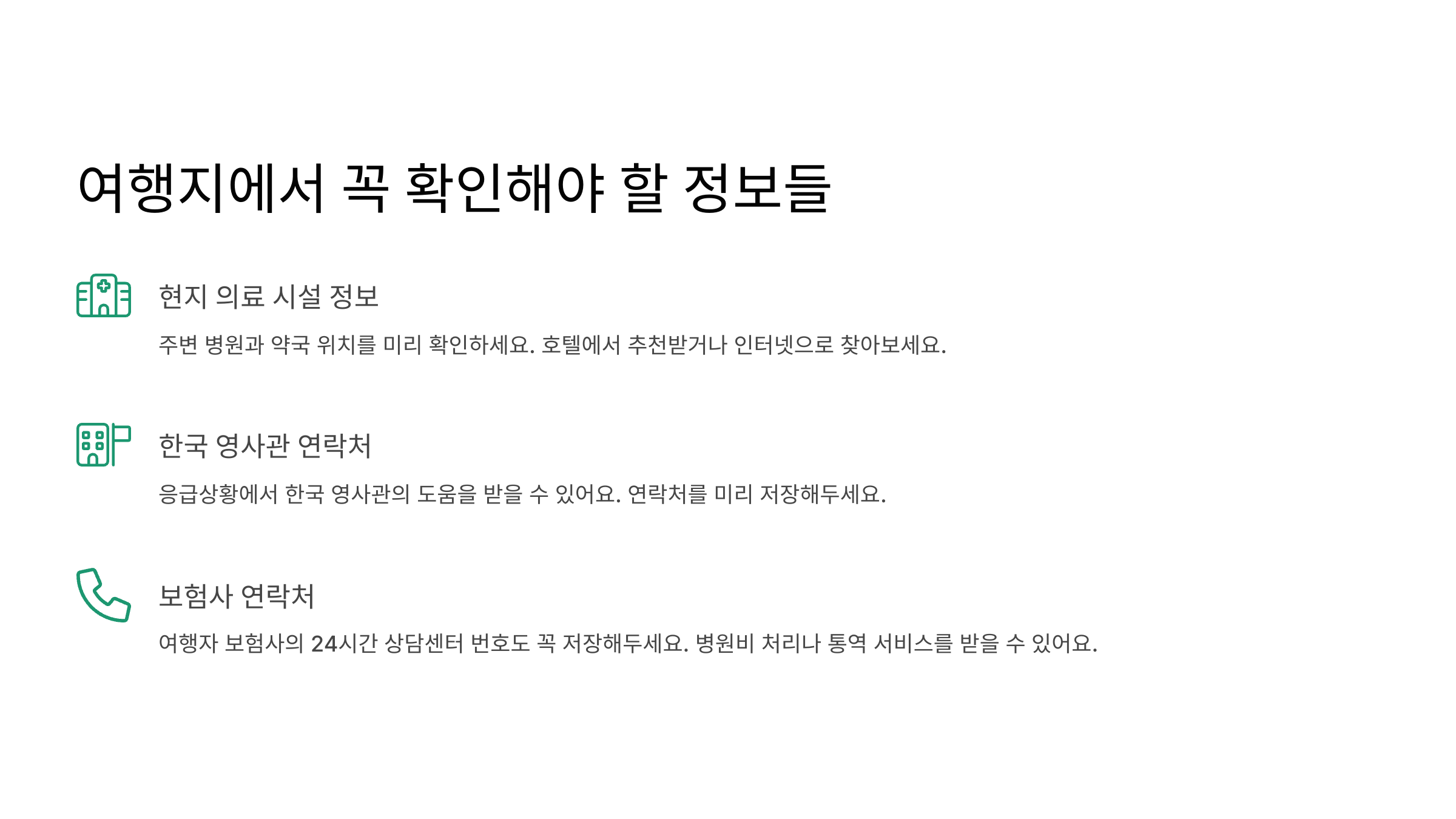 여행자 보험사의 24시간 상담센터 번호도 꼭 저장해두세요. 병원비 처리나 통역 서비스를 받을 수 있어요.