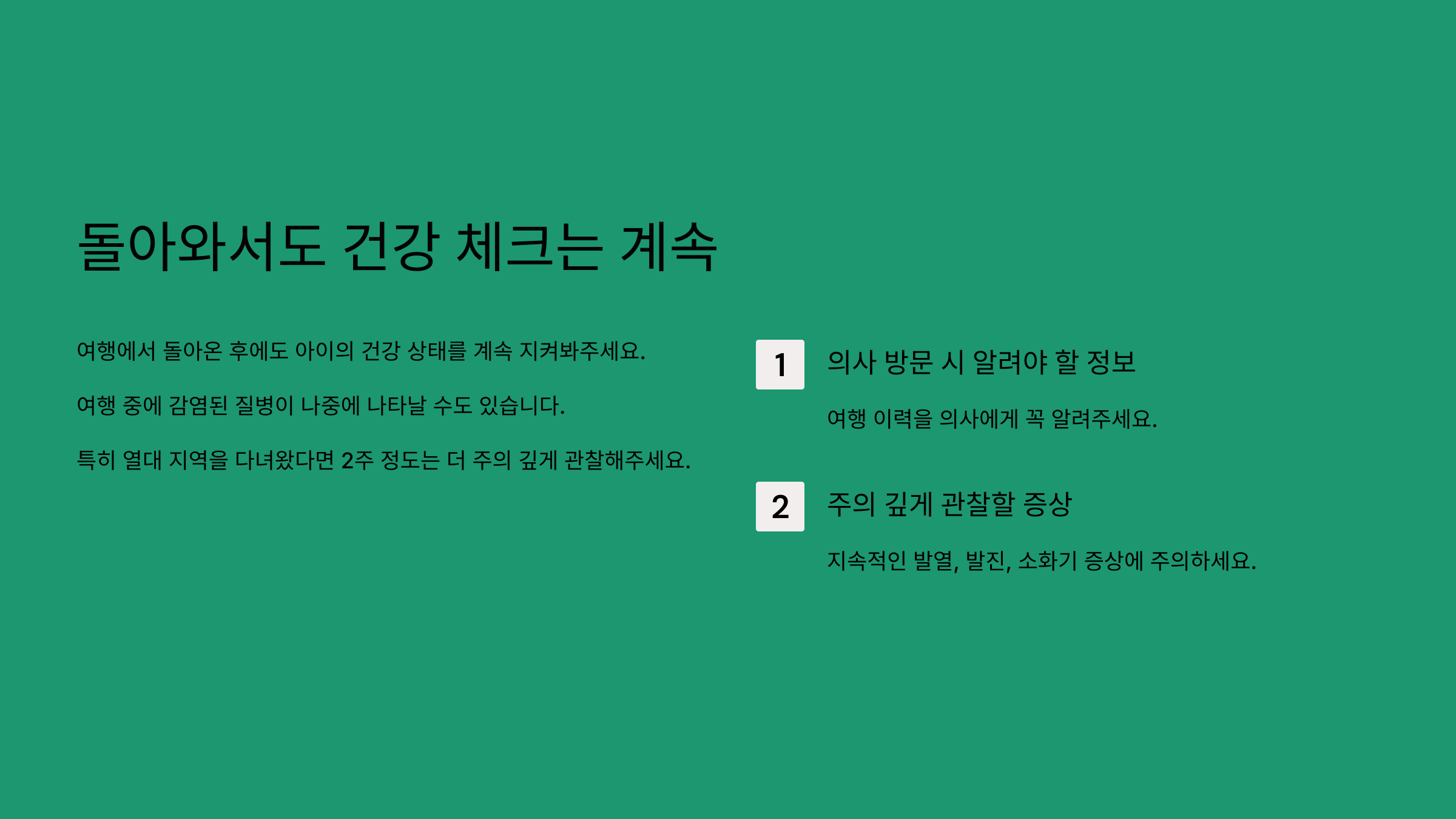 여행에서 돌아온 후에도 아이의 건강 상태를 계속 지켜봐주세요. 여행 중에 감염된 질병이 나중에 나타날 수도 있거든요.