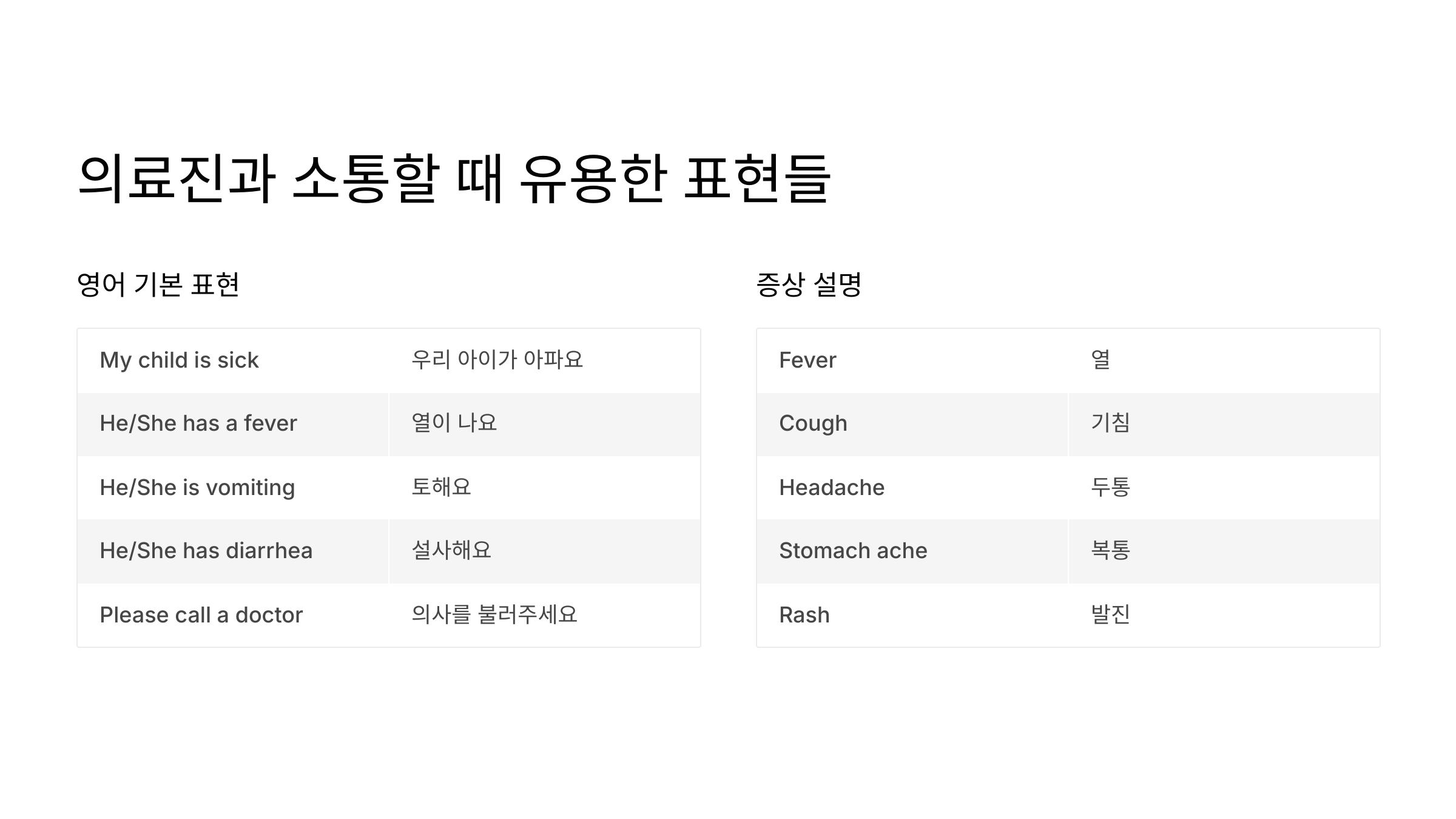 해외에서 의료진과 소통할 때 알아두면 좋은 기본 표현들을 정리해봤어요.