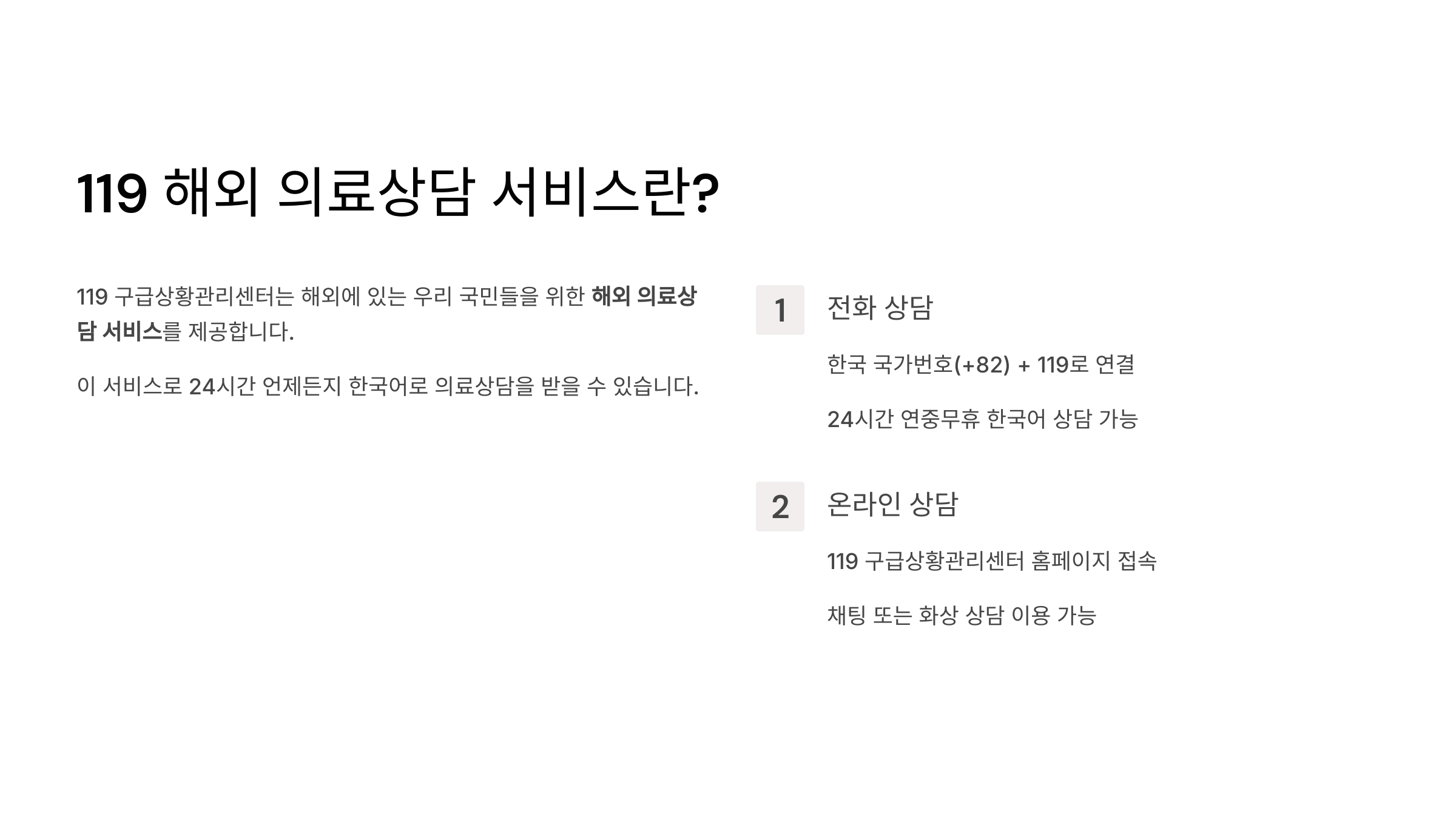 우리나라 119 구급상황관리센터에서는 해외에 있는 우리 국민들을 위한 특별한 서비스를 제공하고 있어요. 바로 해외 의료상담 서비스인데요, 이 서비스를 통해 24시간 언제든지 한국어로 의료상담을 받을 수 있답니다.