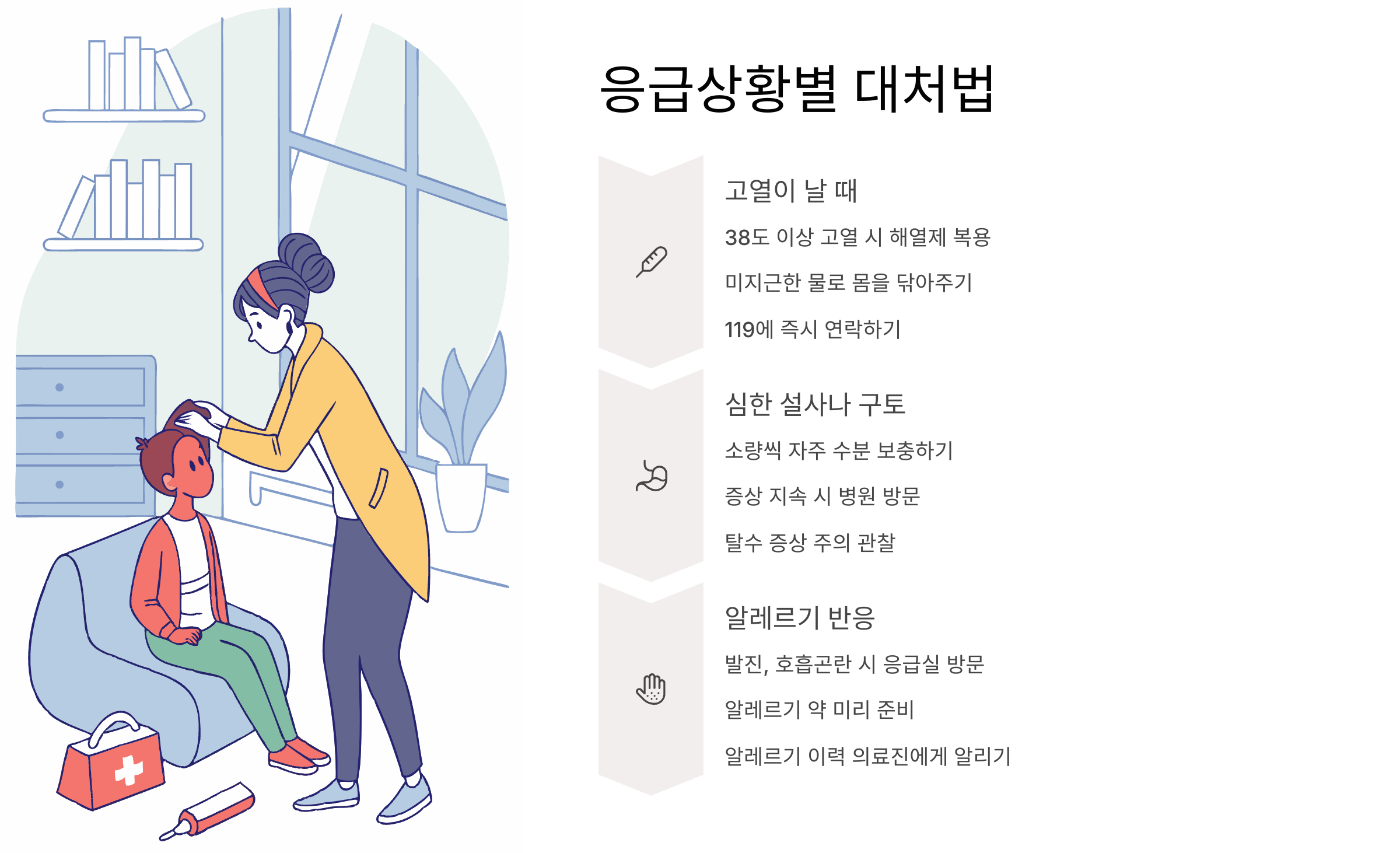 음식이나 약물 알레르기로 인한 발진, 호흡곤란이 나타나면 즉시 응급실로 가야 해요. 알레르기 약을 미리 준비해두는 것도 좋아요.