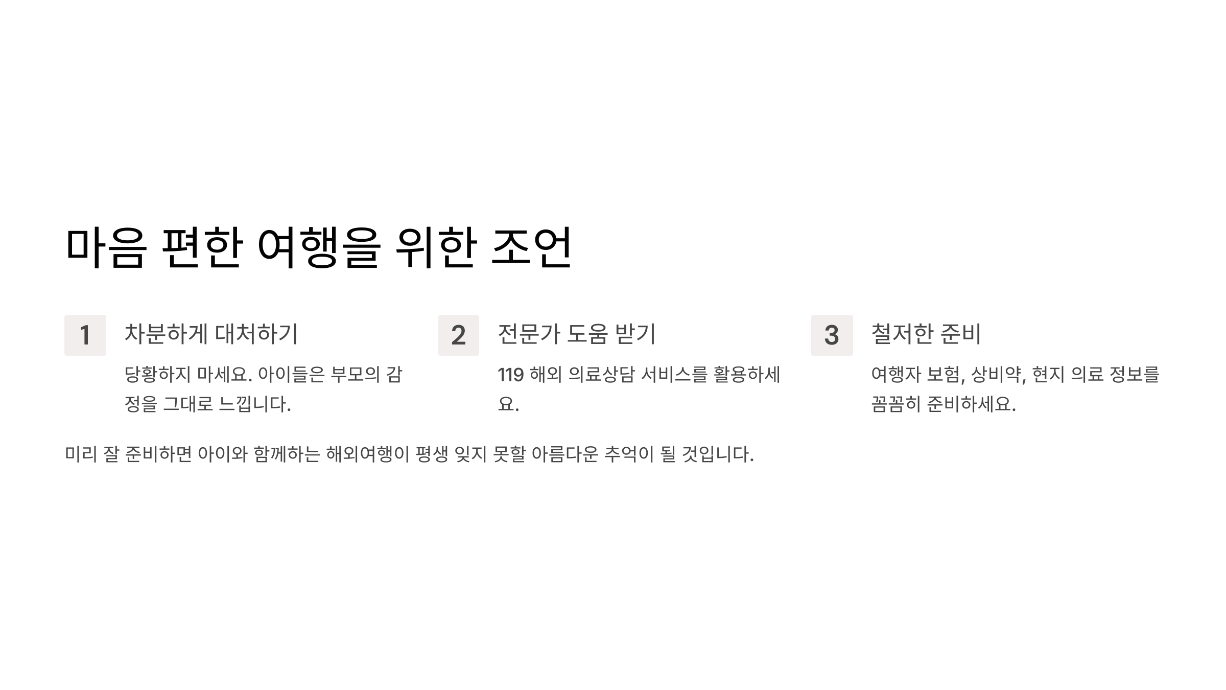 아이와 함께하는 해외여행이 걱정되는 건 당연해요. 하지만 미리 잘 준비하고 119 해외 의료상담 서비스 같은 든든한 지원이 있다는 걸 알고 있으면 훨씬 마음이 편해질 거예요.