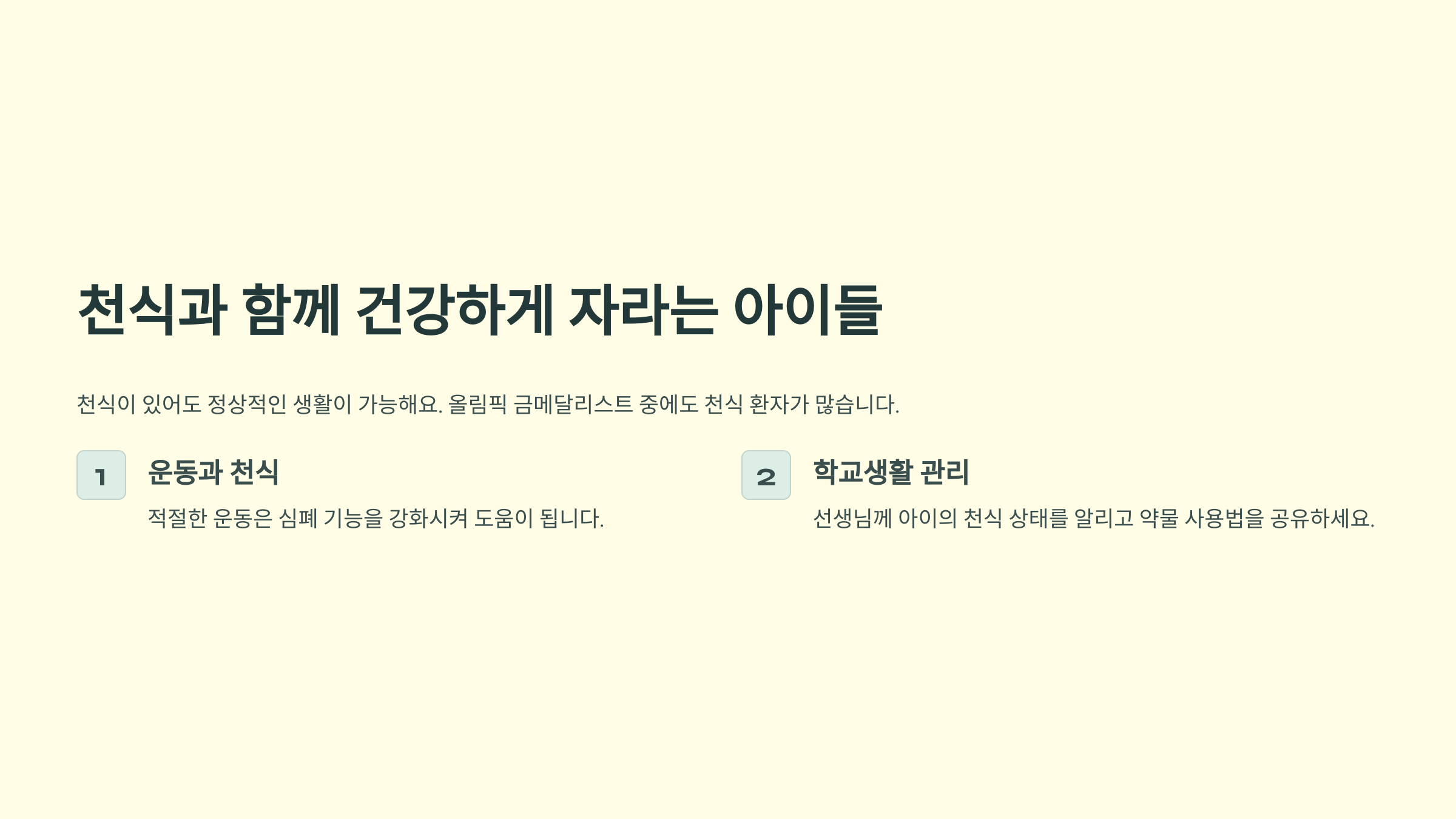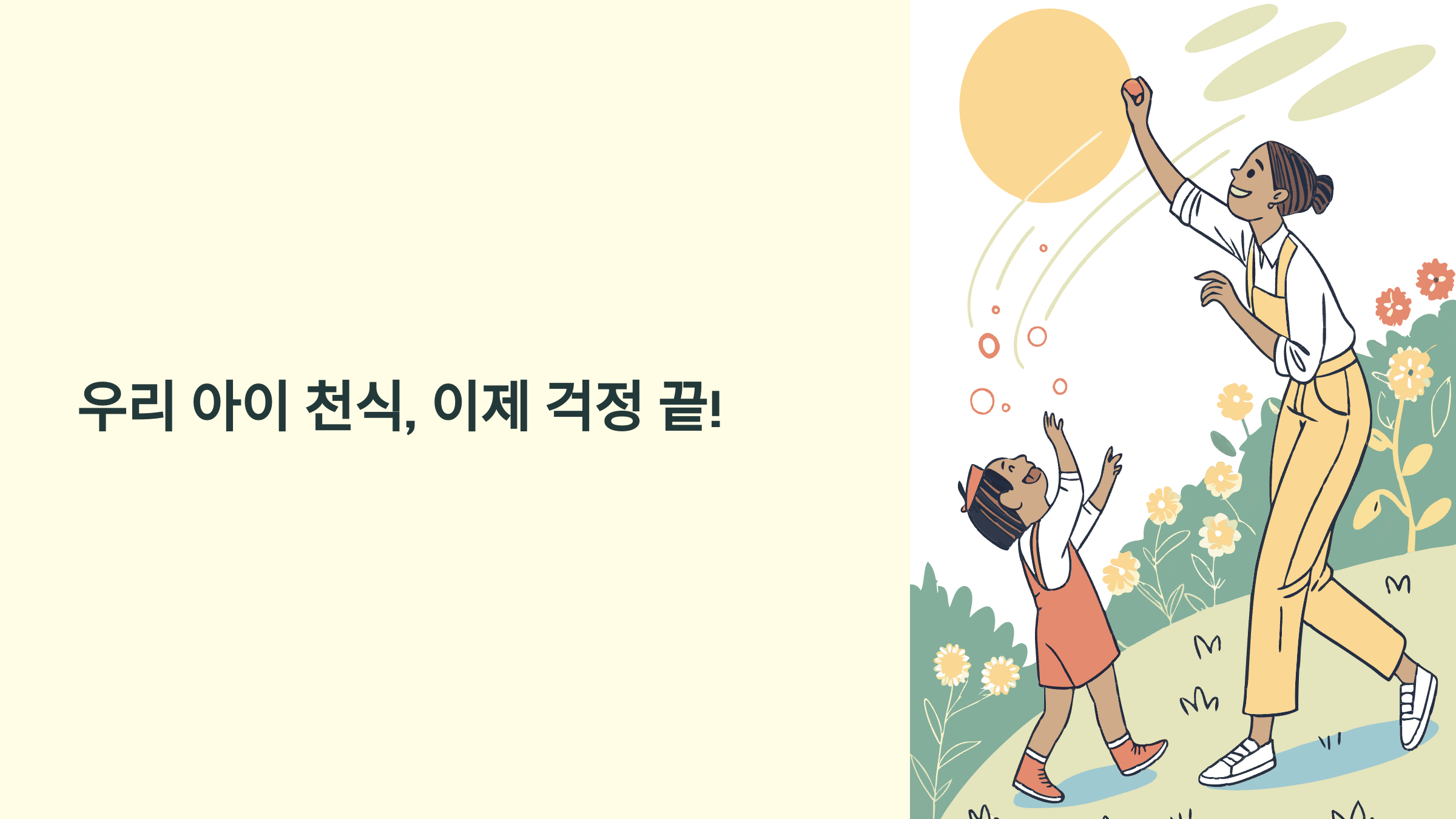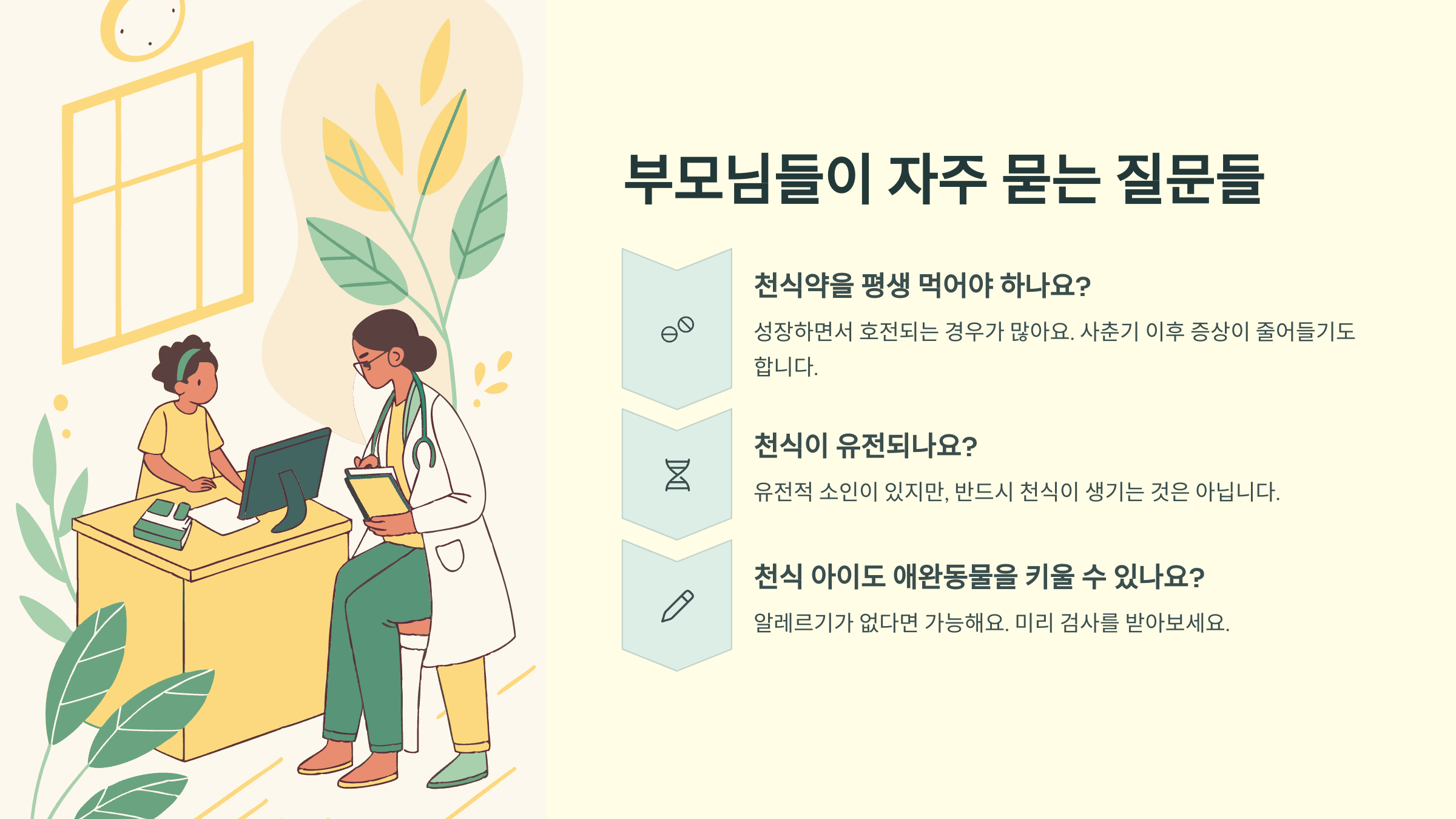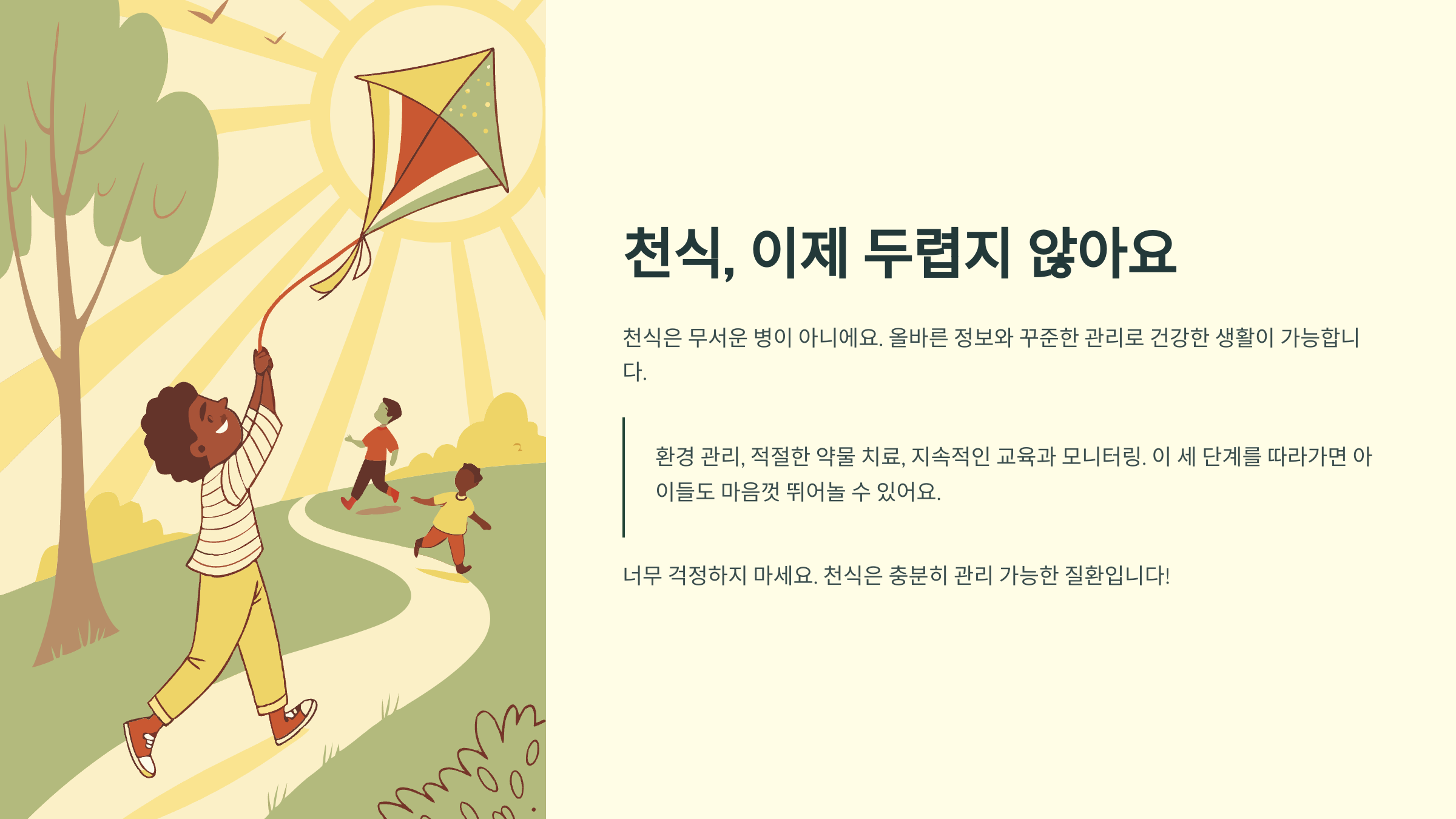 무엇보다 너무 걱정하지 마세요. 부모님의 불안한 마음이 아이에게 전해질 수 있거든요. 천식은 충분히 관리 가능한 질환이라는 걸 믿고, 긍정적인 마음으로 함께 이겨나가요!