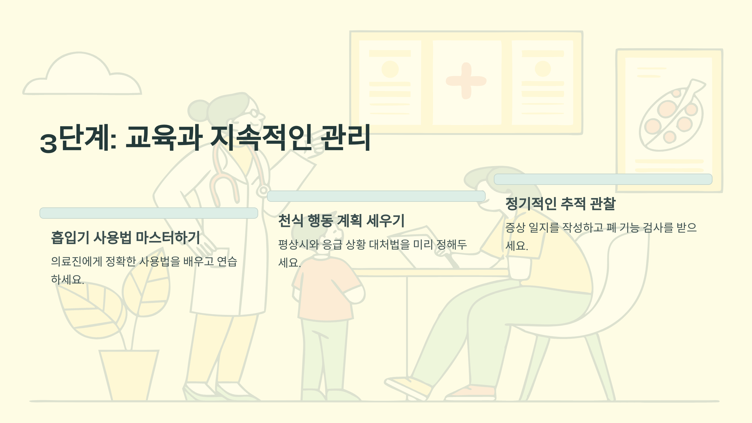 환경 관리부터 시작해서 적절한 약물 치료, 그리고 지속적인 교육과 모니터링까지. 이 세 단계를 차근차근 따라가시면 우리 아이들도 천식 없는 친구들처럼 마음껏 뛰어놀고 건강하게 자랄 수 있을 거예요.