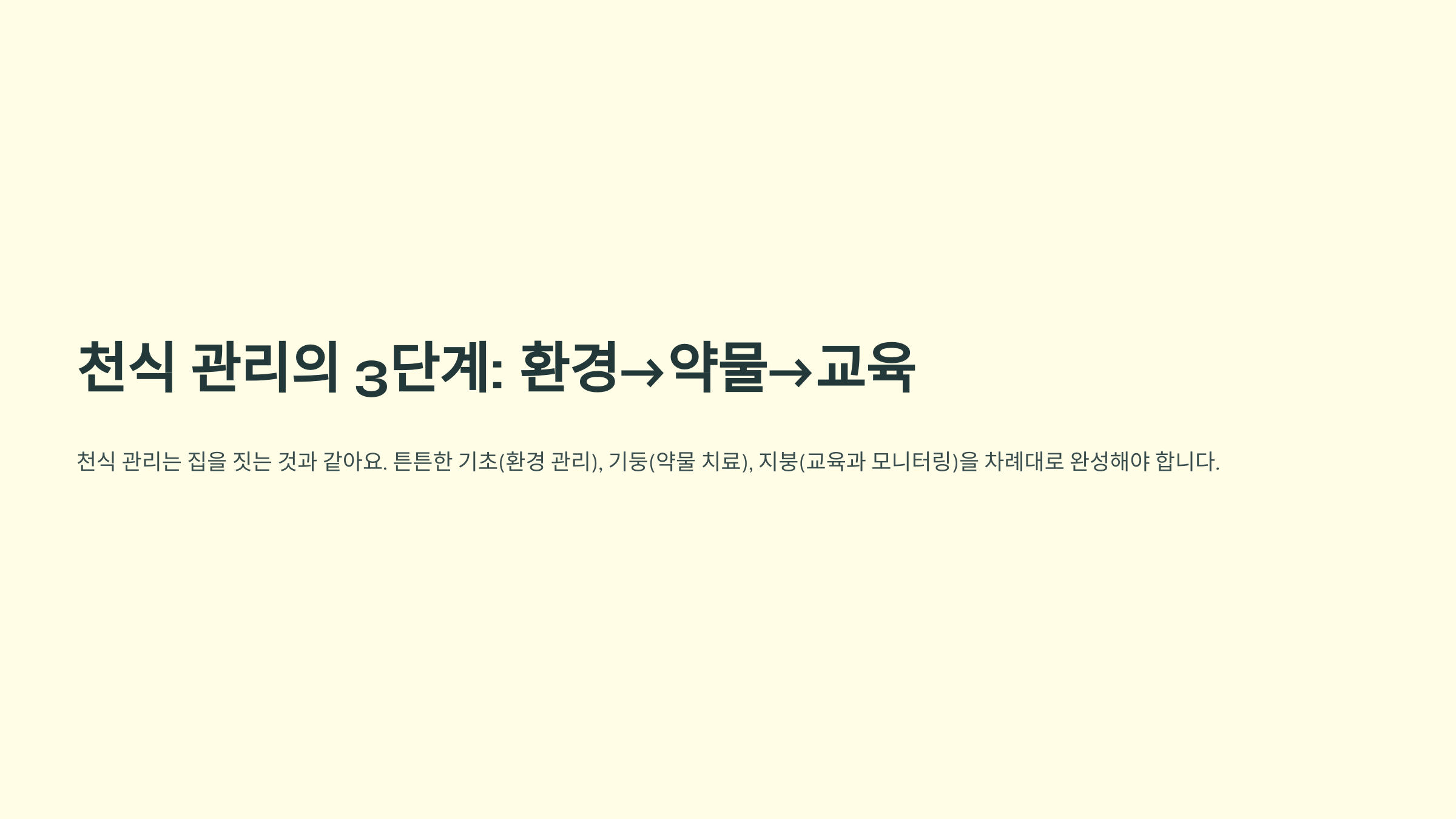 천식 관리는 마치 집을 짓는 것과 같아요. 튼튼한 기초(환경 관리)부터 시작해서 기둥(약물 치료), 마지막으로 지붕(교육과 모니터링)까지 차례대로 완성해야 해요.