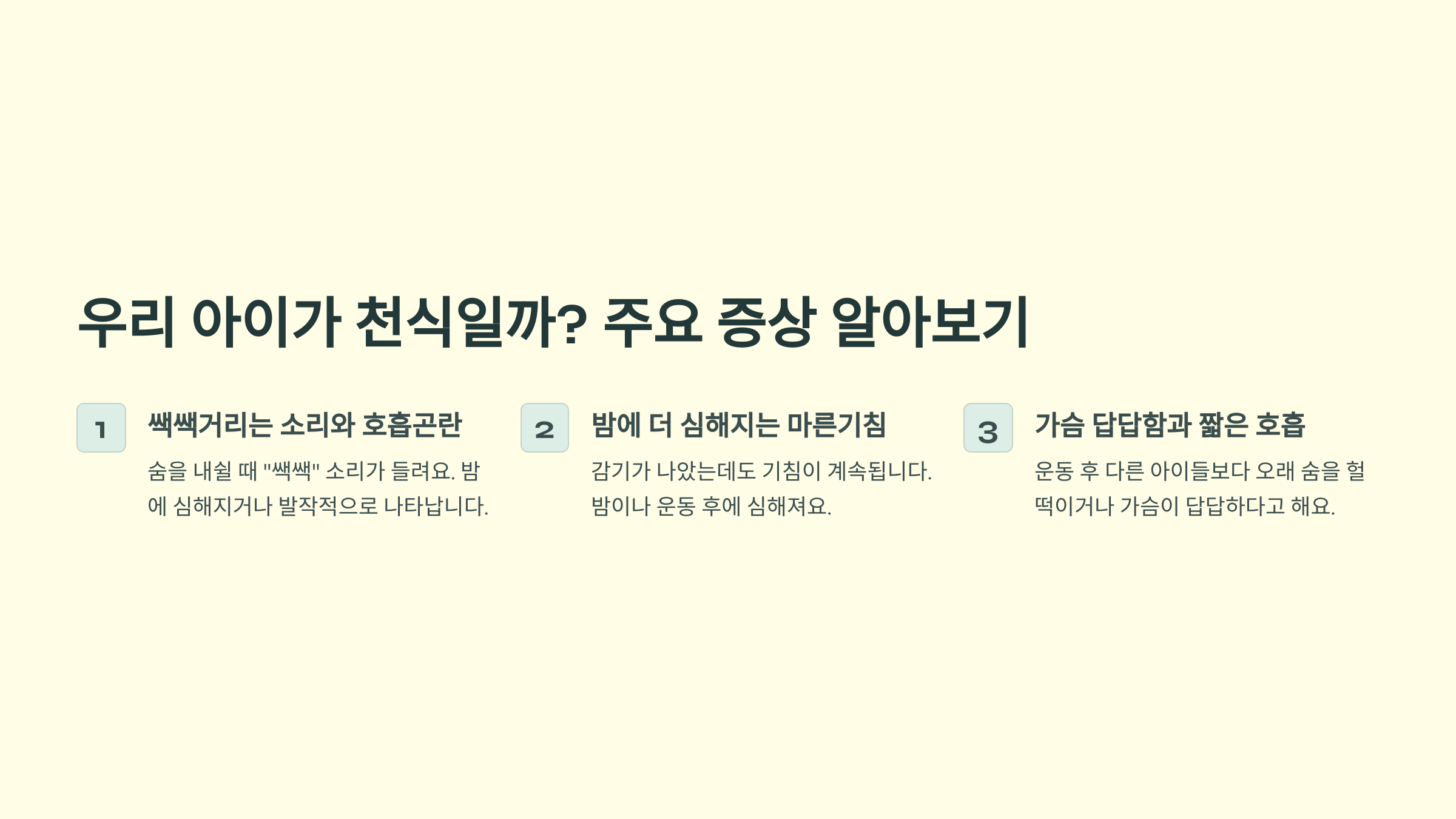 쌕쌕거리는 소리와 호흡곤란 숨을 내쉴 때 "쌕쌕" 하는 소리가 들리는 게 가장 특징적인 증상이에요. 특히 밤에 심해지거나 갑자기 발작적으로 나타나기도 해요. 아이가 숨쉬기 힘들어하면서 가슴을 움켜쥐는 모습을 보이기도 하죠.