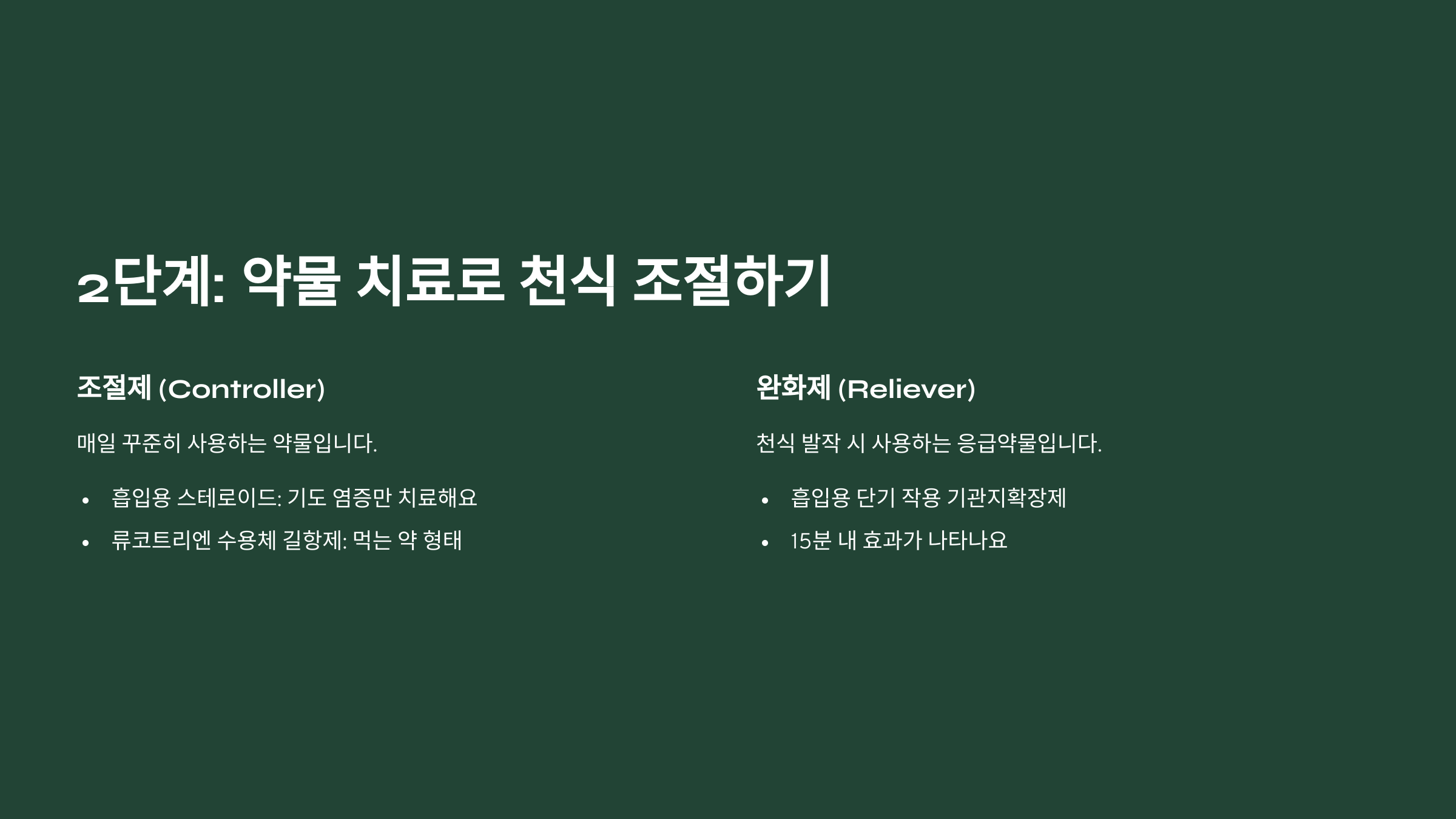 천식 약물은 크게 두 종류로 나눌 수 있어요. 평상시에 꾸준히 먹는 '조절제'와 급할 때 쓰는 '완화제'로 나뉘죠.