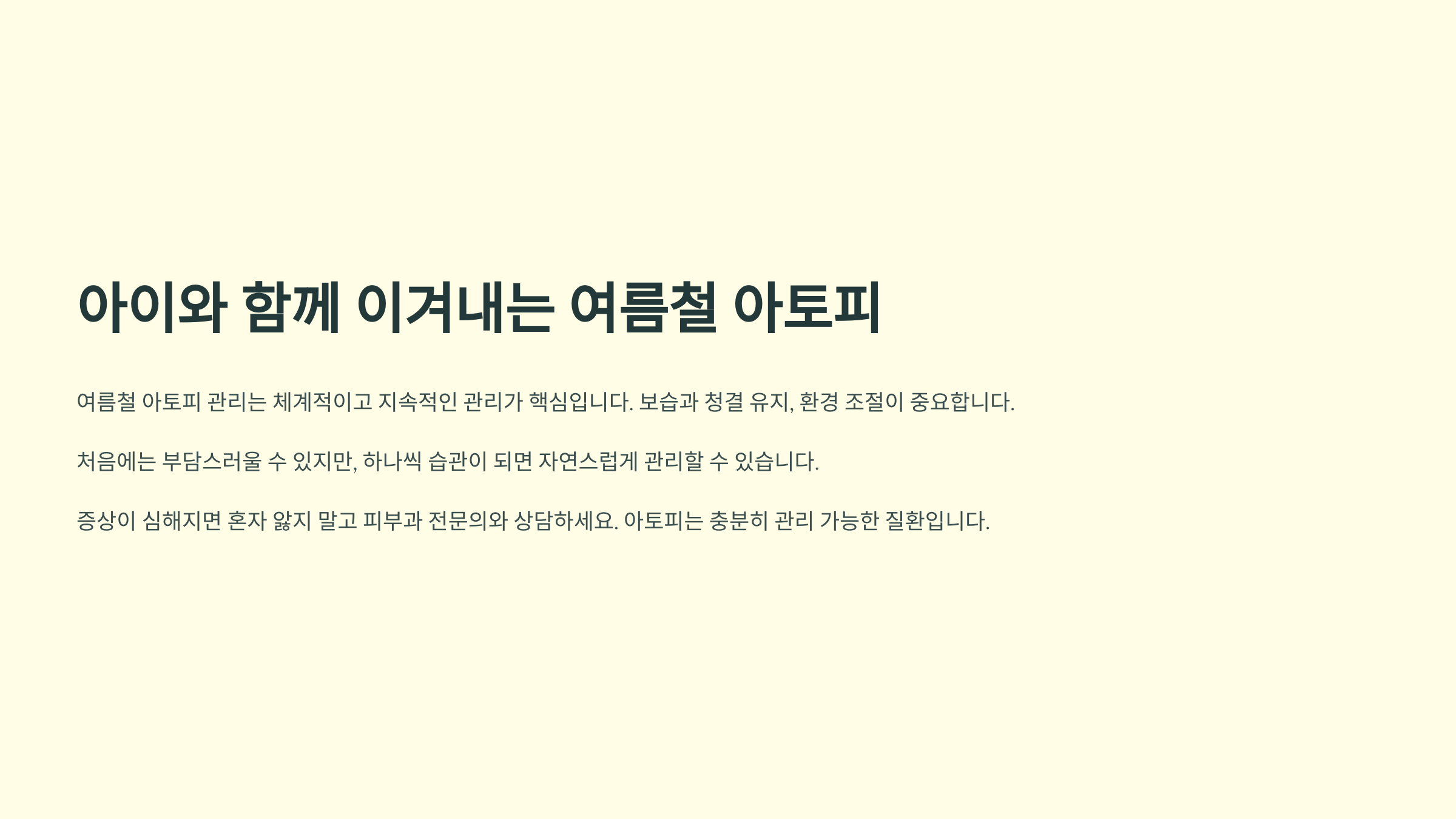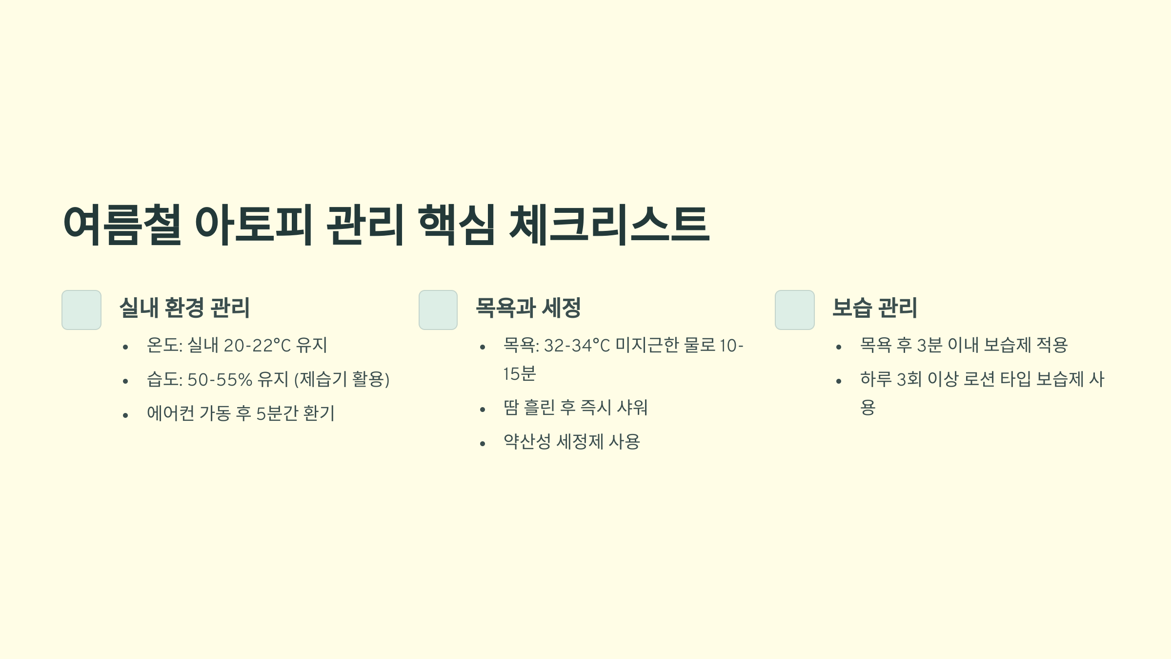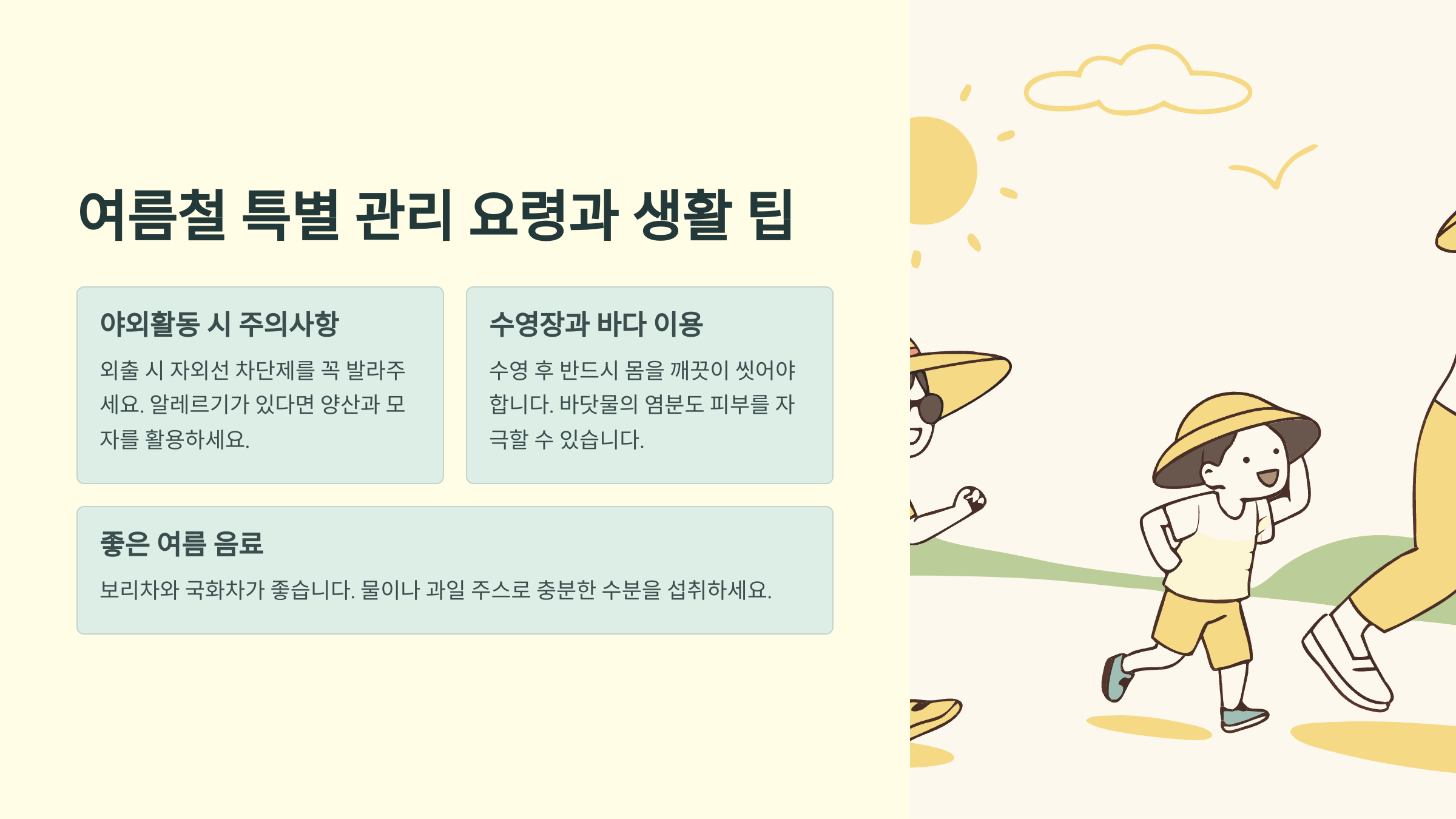여름철 아토피 관리는 정말 체계적이고 지속적인 관리가 핵심이에요. 무엇보다 적절한 보습과 청결 유지, 그리고 환경 조절을 통해 우리 아이가 편안한 여름을 보낼 수 있도록 도와주는 것이 중요해요.