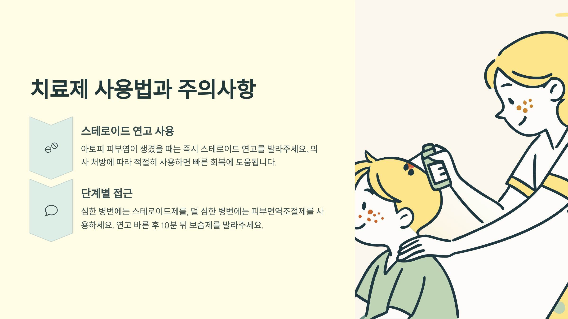 아토피 피부염이 생겼을 때는 즉시 스테로이드 연고를 발라주어야 치료 기간을 줄일 수 있어요. 많은 부모님들이 스테로이드를 무서워하시는데, 의사의 처방에 따라 적절히 사용하면 오히려 빠른 회복에 도움이 돼요.