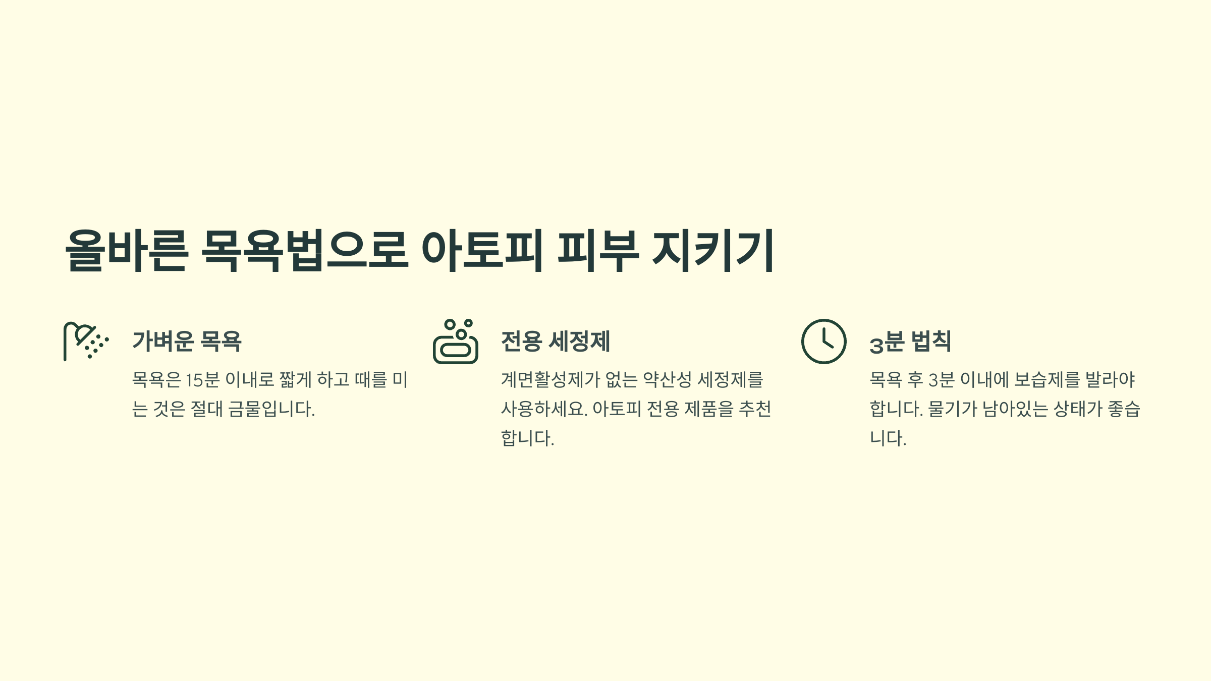 32~34℃의 미지근한 물에서 10~20분 이내로 매일 통목욕 하는 것이 가장 좋고, 필요한 경우 간단한 샤워를 할 수 있어요. 그 후에는 반드시 3분 이내에 보습제를 발라주는 것을 잊지 마세요.