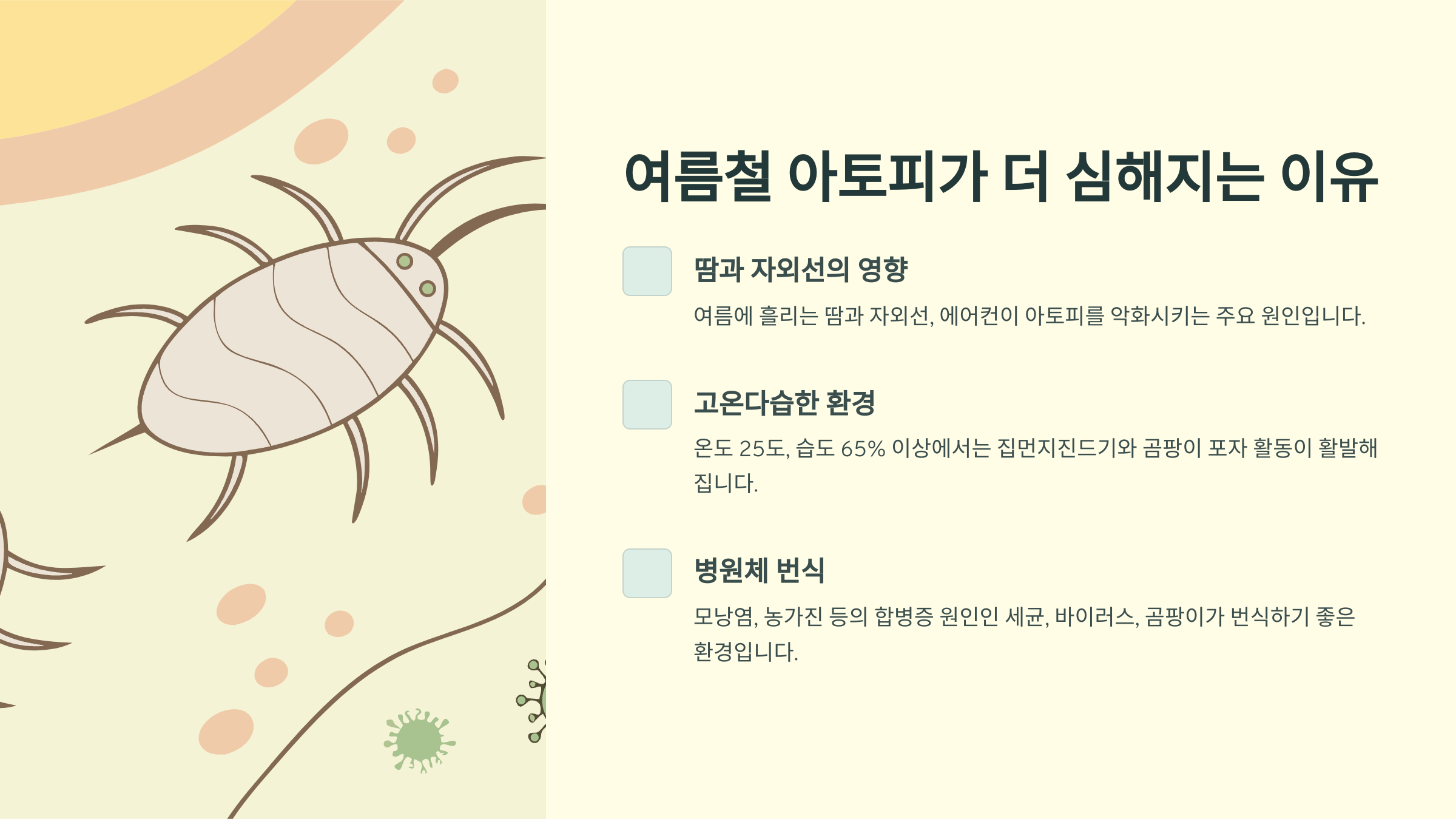 게다가 여름철에 유행하는 아토피 피부염의 합병증으로는 모낭염, 농가진, 농피증, 지루성 피부염 등이 있는데, 이들의 원인은 모두 세균, 바이러스, 곰팡이예요. 결국 고온다습한 여름 환경이 이런 병원체들의 번식을 도와 아토피를 더욱 악화시키는 거죠.