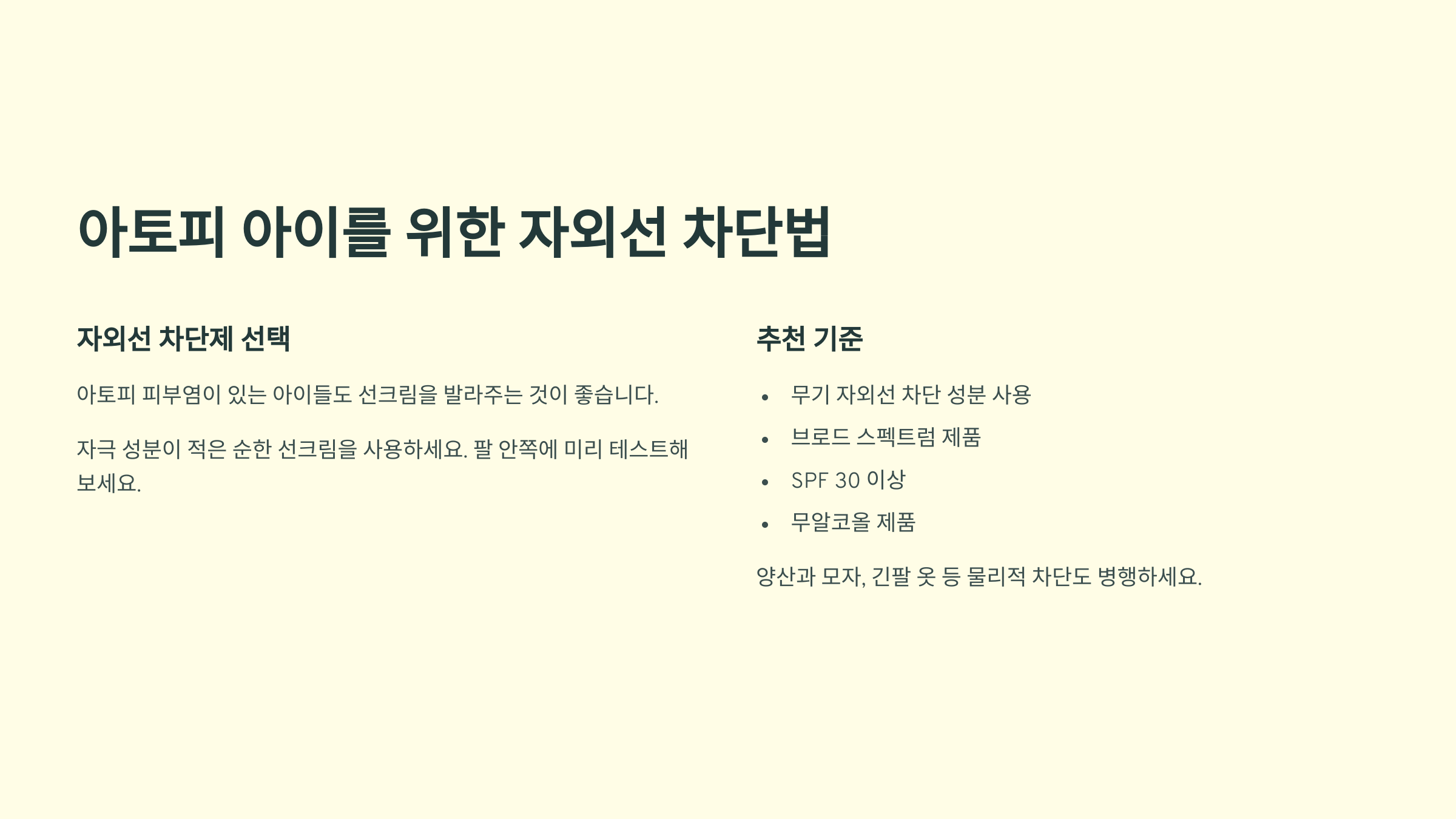 아토피 피부염이 있는 아이들도 선크림을 발라주는 것이 좋아요. 자외선은 비타민 D 합성 등 유용한 효과도 있지만, 노출이 축적됨에 따라 일광화상, 피부암 발생, 광과민 질환 발생 등 피부에 다양한 악영향을 초래할 수 있으니까 어릴 때부터 차단을 해주는 것이 중요해요.