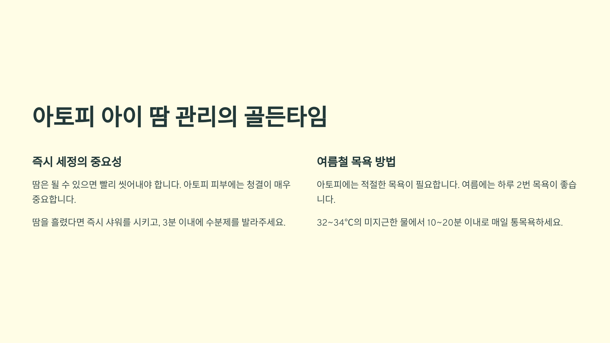 하지만 포기하지 마세요! 올바른 관리법만 알면 여름철에도 충분히 아토피를 잘 관리할 수 있어요. 오늘은 여러 전문가들의 조언과 실제 경험을 바탕으로 아토피 아이들의 여름철 관리법을 자세히 알려드릴게요.