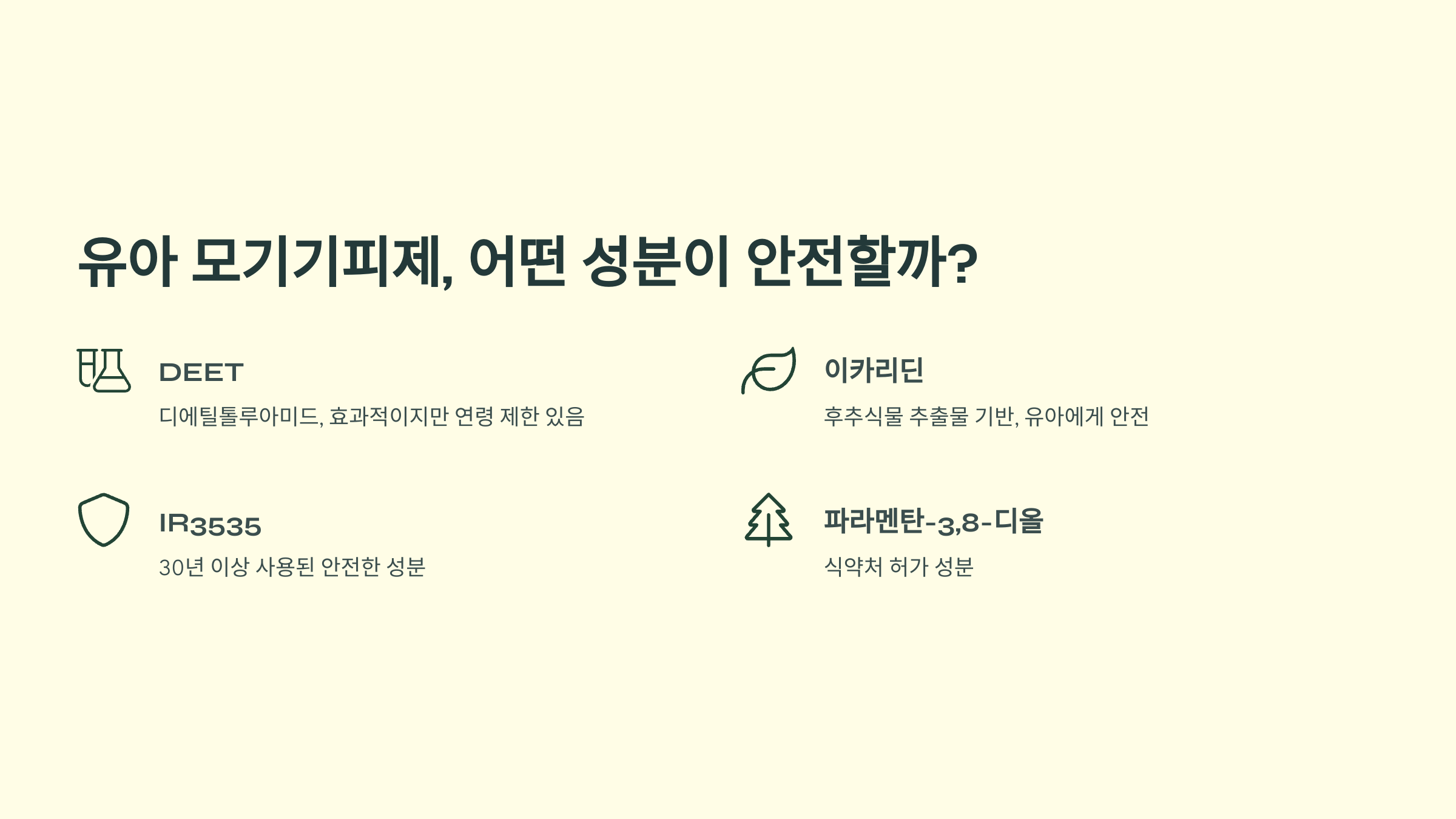 식약처에서 허가한 모기기피제 성분은 총 4가지예요. DEET(디에틸톨루아미드), 이카리딘, IR3535, 파라멘탄-3,8-디올이 바로 그것들이죠. 각 성분마다 연령 제한과 사용법이 다르니까 꼼꼼히 확인해보세요.