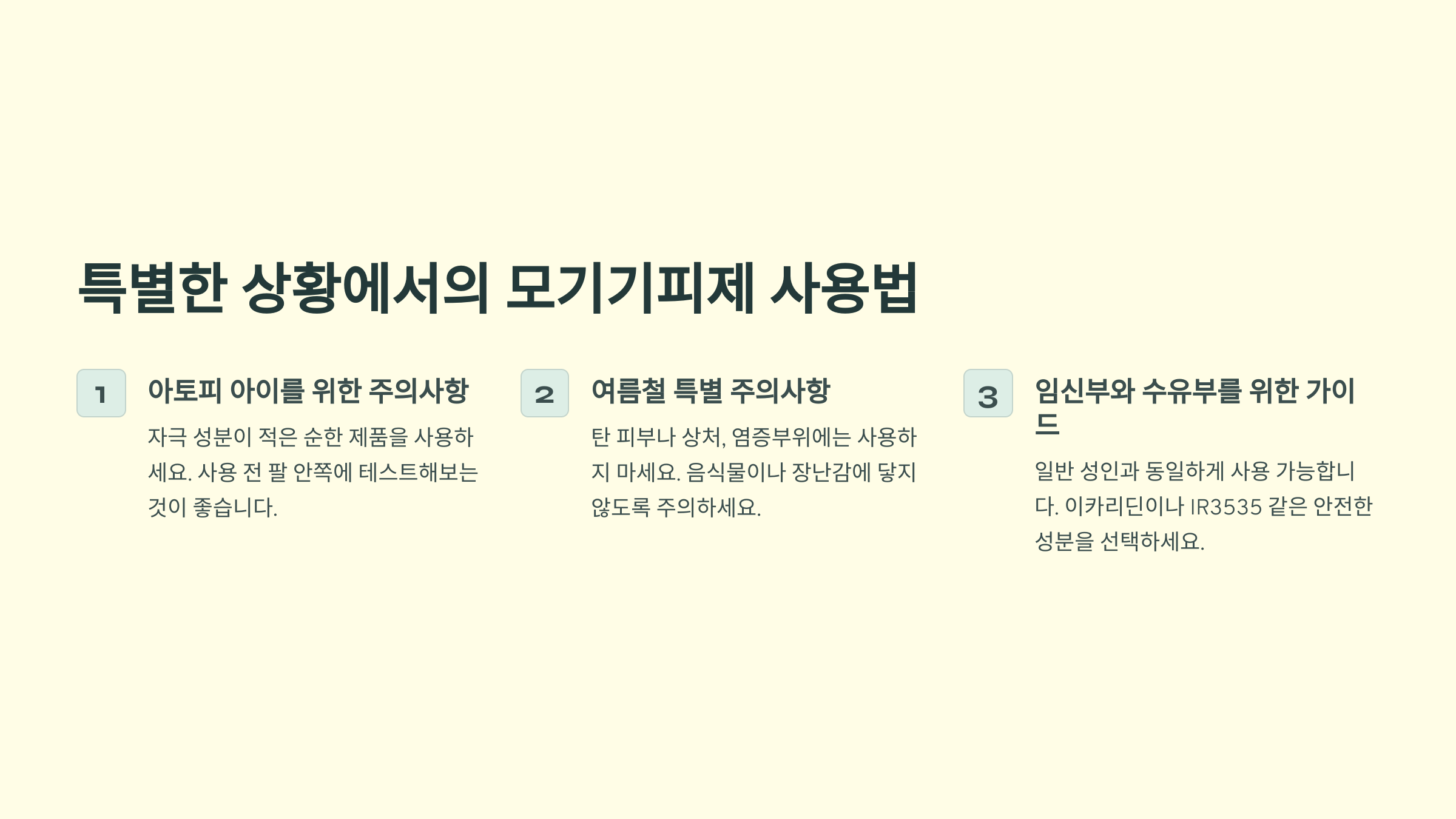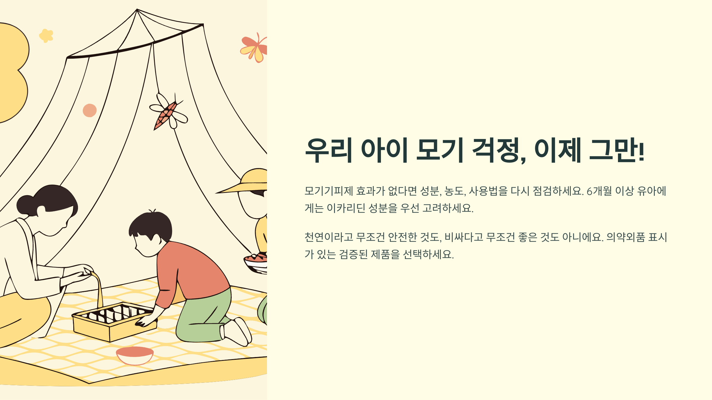 천연이라고 해서 무조건 안전한 것도 아니고, 비싸다고 해서 무조건 좋은 것도 아니에요. 의약외품 표시가 있는 검증된 제품을 선택하고, 우리 아이의 연령과 피부 상태에 맞게 사용한다면 안전하고 효과적으로 모기로부터 보호할 수 있을 거예요.