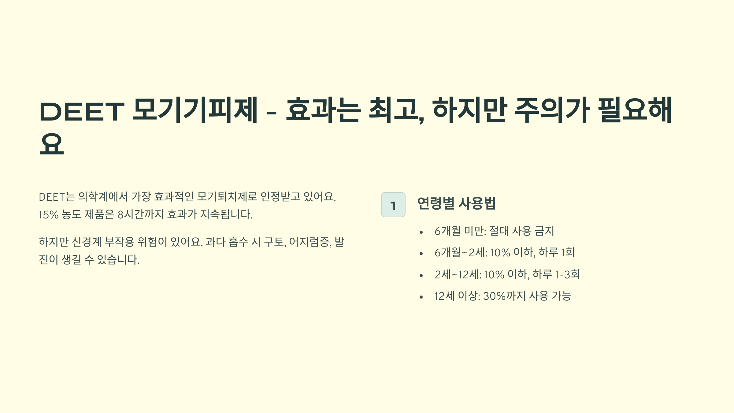 - 6개월~2세: DEET 농도 10% 이하, 하루 1회만