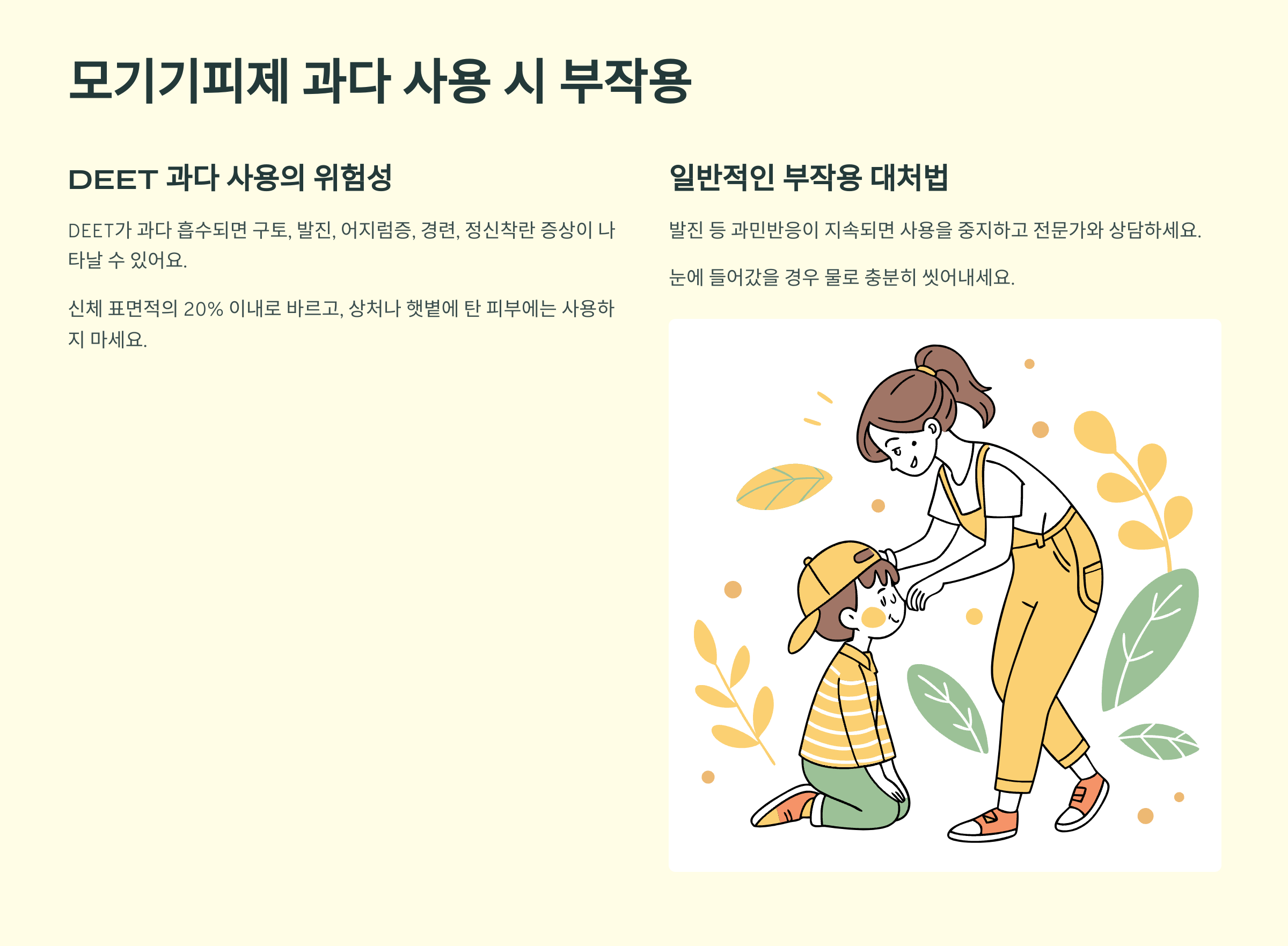 DEET가 피부를 통해 몸속에 과다 흡수되면 구토, 발진, 어지럼증, 경련, 정신착란 등의 증상이 나타날 수 있어요. 이 때문에 신체 표면적의 20%가 넘지 않도록 바르고, 상처 부위나 햇볕에 탄 피부에는 흡수가 잘되기 때문에 사용해선 안 돼요.