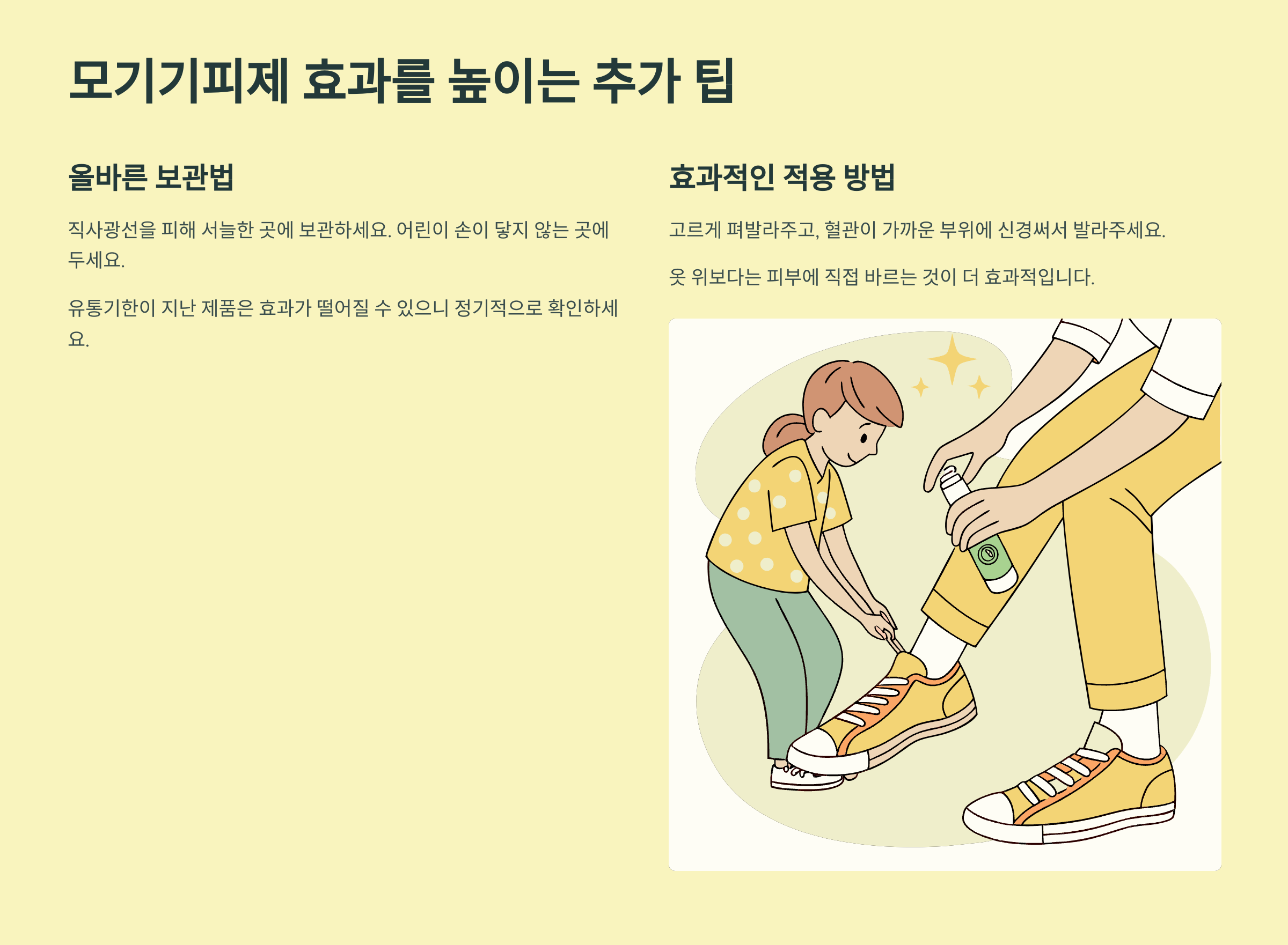 모기기피제는 직사광선을 피해 서늘한 곳에 보관하고, 어린이의 손이 닿지 않는 곳에 두세요. 유통기한이 지난 제품은 효과가 떨어질 수 있으니 정기적으로 확인해주세요.