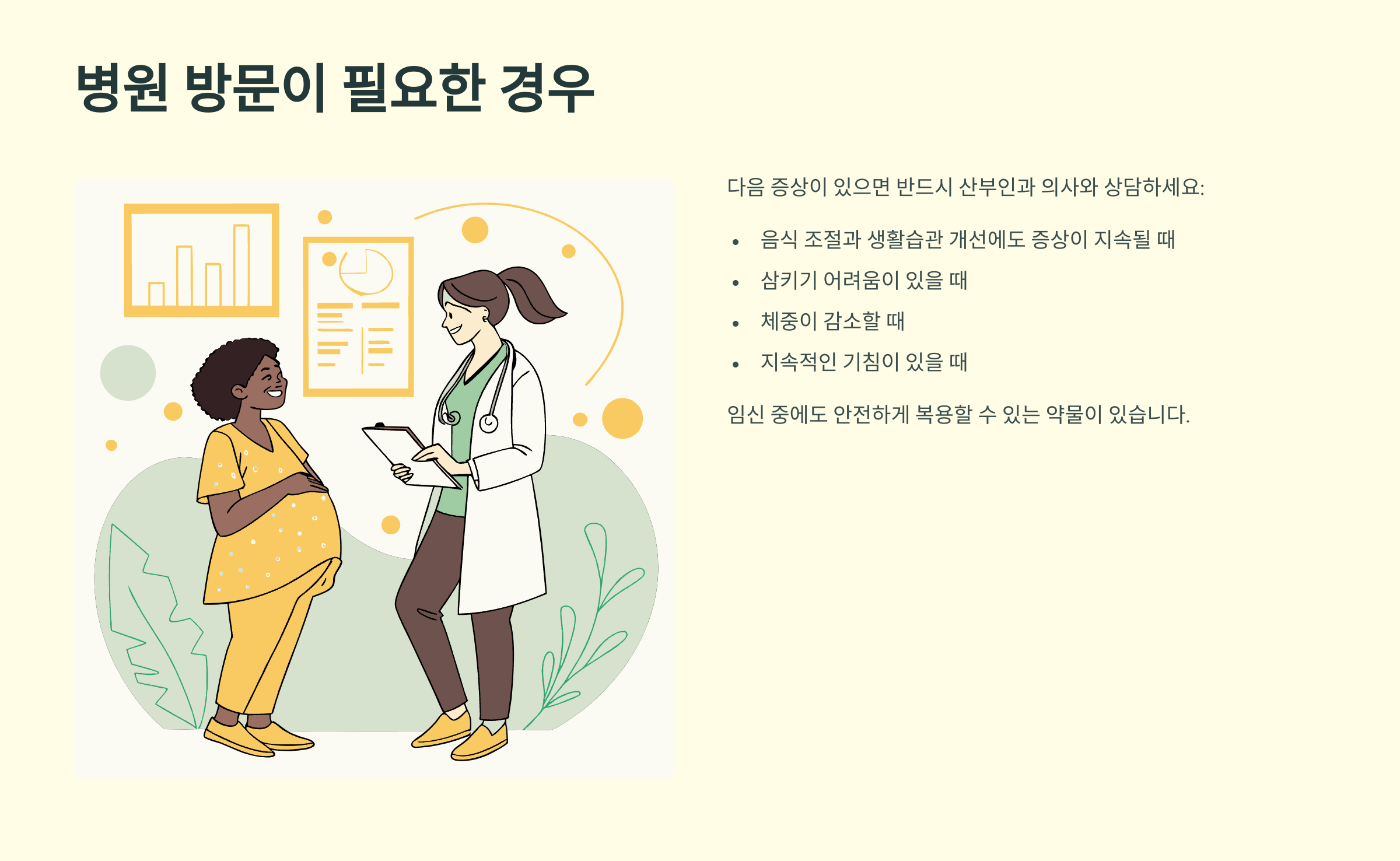 음식 조절과 생활습관 개선으로도 증상이 나아지지 않거나, 삼키기 어려움, 체중 감소, 지속적인 기침 등의 증상이 나타나면 반드시 산부인과 의사와 상의하세요. 임신 중에도 안전하게 복용할 수 있는 약물이 있으니, 너무 참지 마시고 적절한 치료를 받으시는 것이 중요해요.