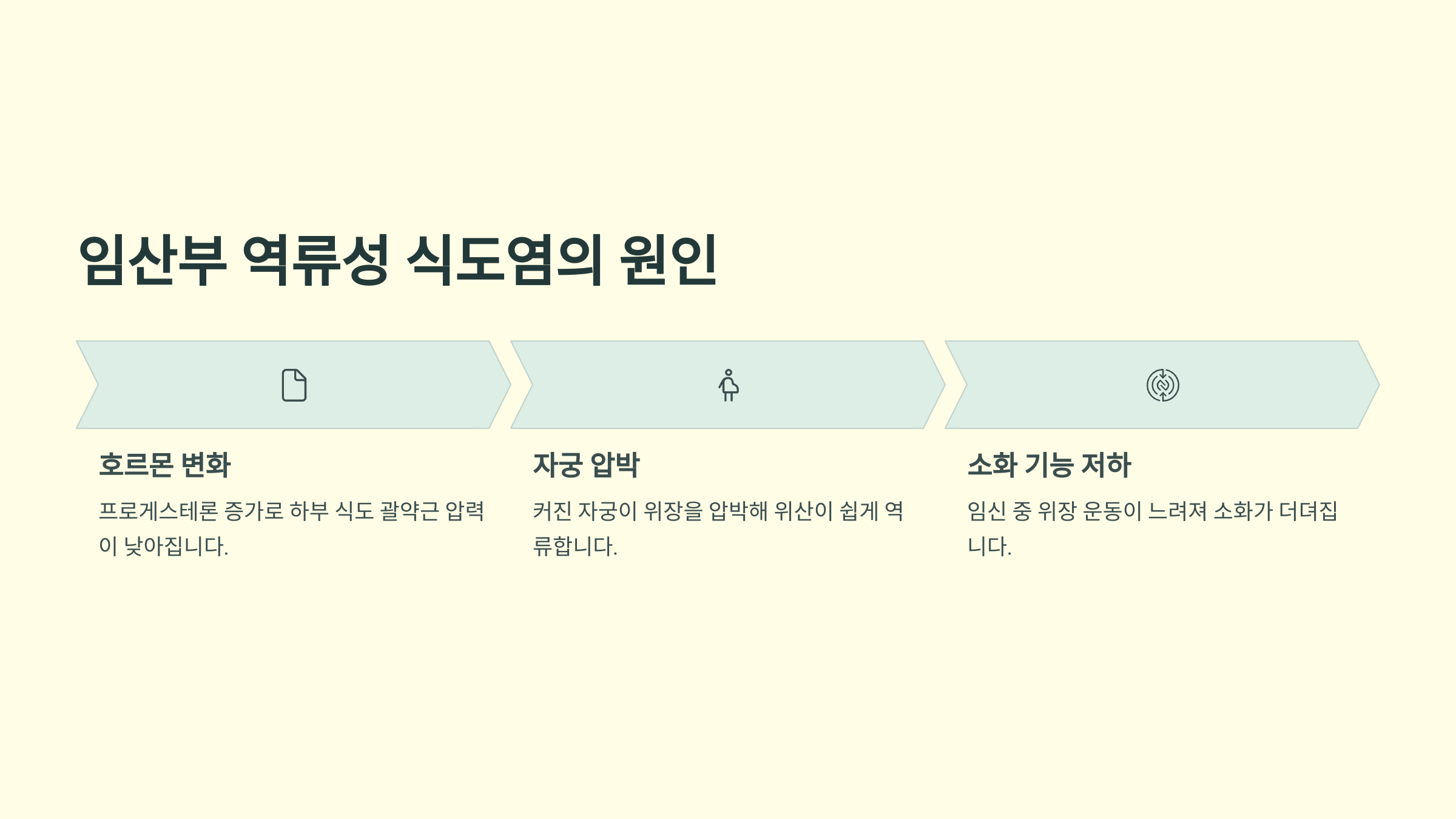 게다가 임신 중기와 후기로 갈수록 자궁이 커지면서 위장을 압박하게 되고, 이로 인해 위산이 더 쉽게 식도로 밀려 올라오게 돼요. 또한 임신 중에는 전체적으로 위장 운동이 느려지면서 소화가 더딘 상태가 되어 역류성 식도염 증상이 더욱 심해지는 거랍니다.