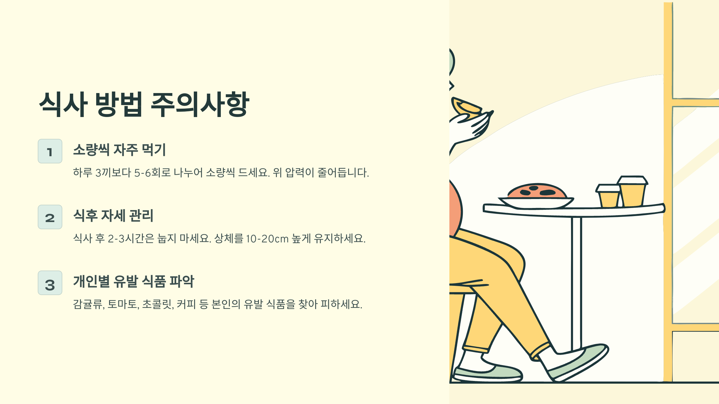 식후 바로 눕지 마세요 식사 후 최소 2-3시간은 활동을 유지하시고, 눕더라도 상체를 높게 해서 주무시는 것이 좋아요. 베개를 10-20cm 정도 높이거나 침대 머리 부분을 올려서 주무시면 도움이 됩니다.