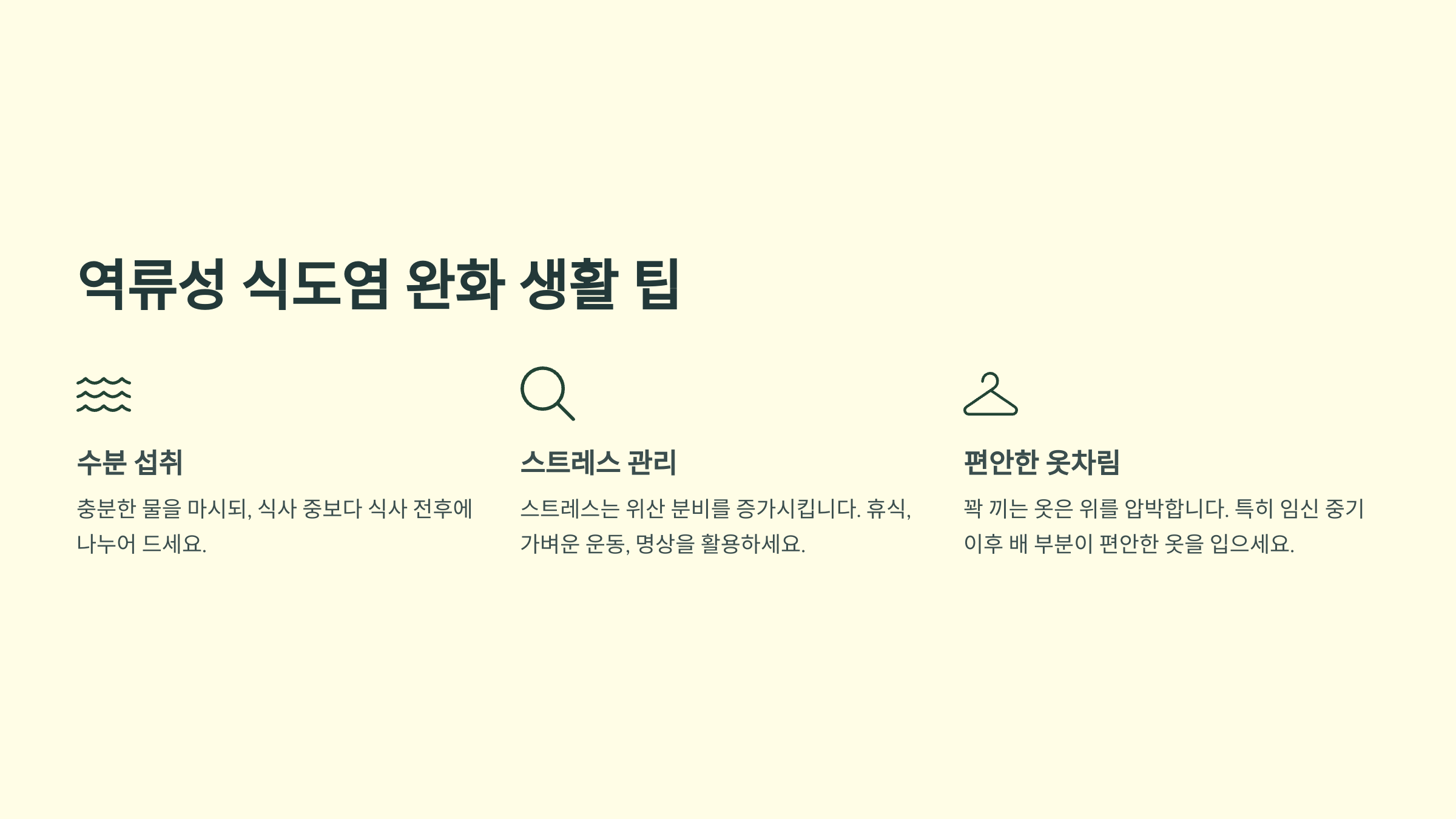 너무 꽉 끼는 옷은 위를 압박해서 역류를 악화시킬 수 있어요. 특히 임신 중기 이후에는 배 부분이 편안한 옷을 입으시는 것이 좋습니다.