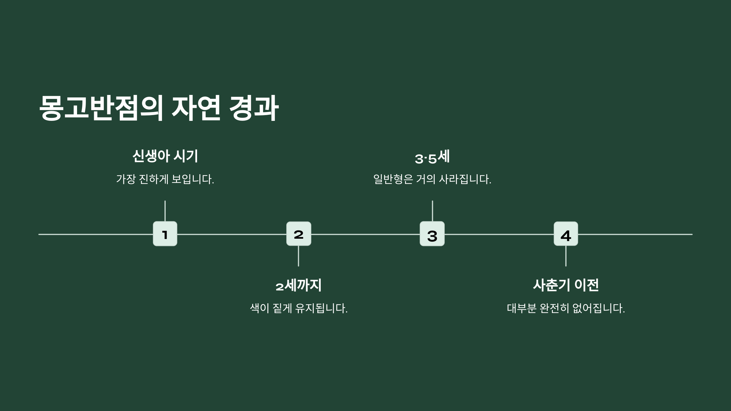 대부분의 일반형 몽고반점은 3~5세 사이에 거의 사라지고, 사춘기 이전에는 완전히 없어지는 경우가 많아요. 하지만 진한형이나 이소성형의 경우는 자연 소실이 어려워서 치료를 고려해야 할 수도 있어요.