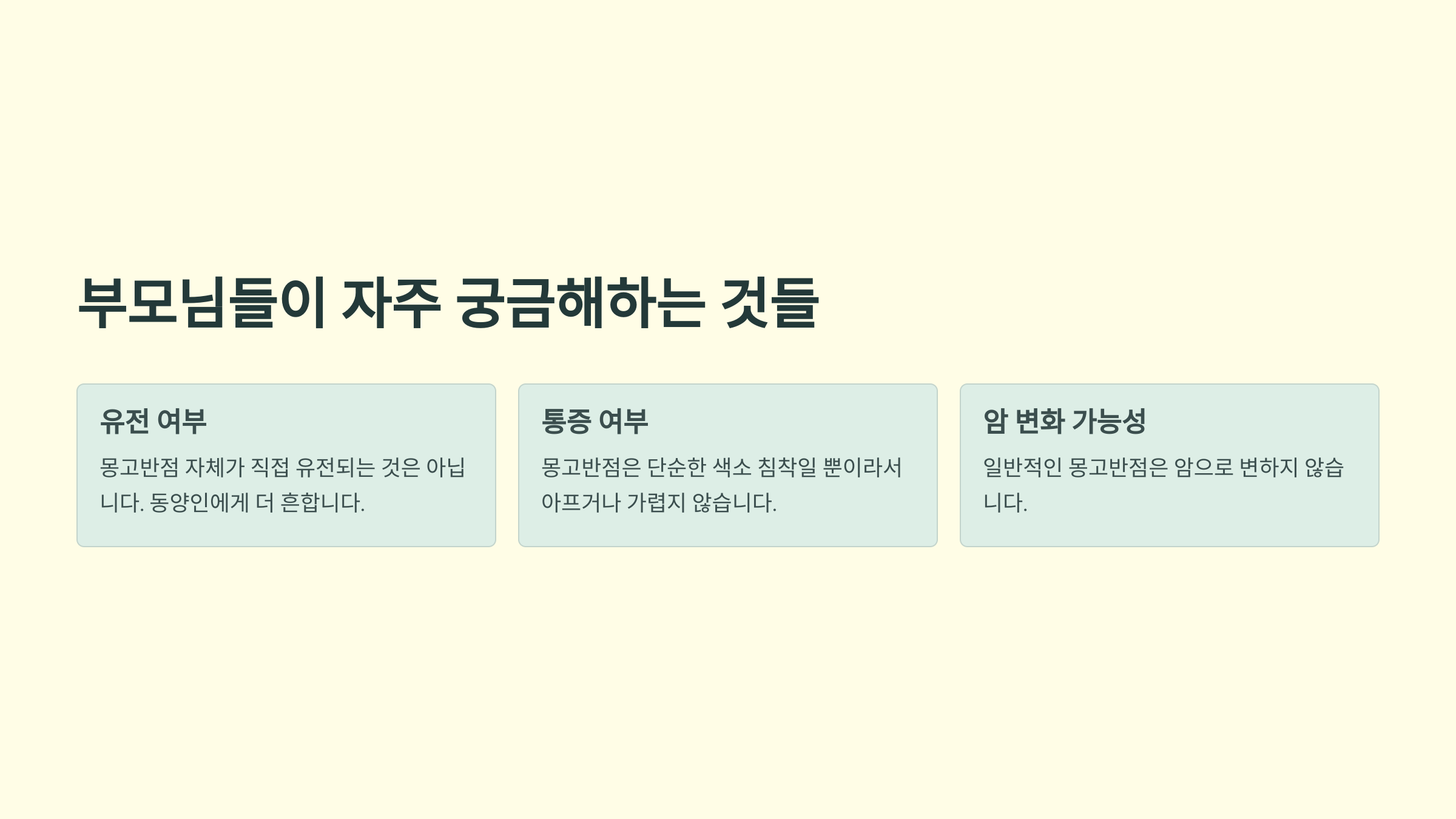 A: 일반적인 몽고반점은 암으로 변하지 않아요. 하지만 진한형의 경우 드물게 청색 모반으로 발전할 수 있어서 정기적인 관찰이 필요해요.