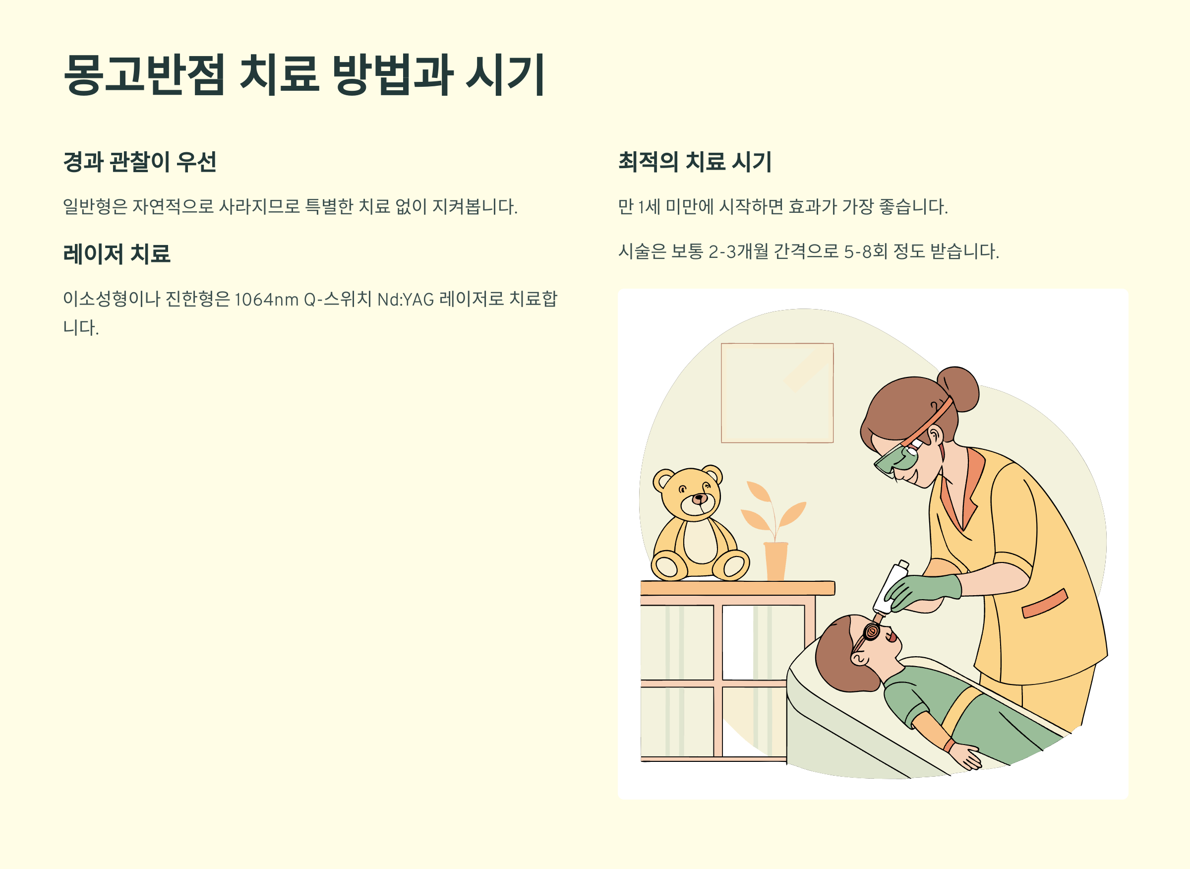 일반형 몽고반점은 자연적으로 사라지는 경향이 강하기 때문에 특별한 치료 없이 지켜보는 것이 일반적이에요. 만약 자연 소실이 지연된다면 7~8세 이후에 치료를 결정해도 늦지 않아요.