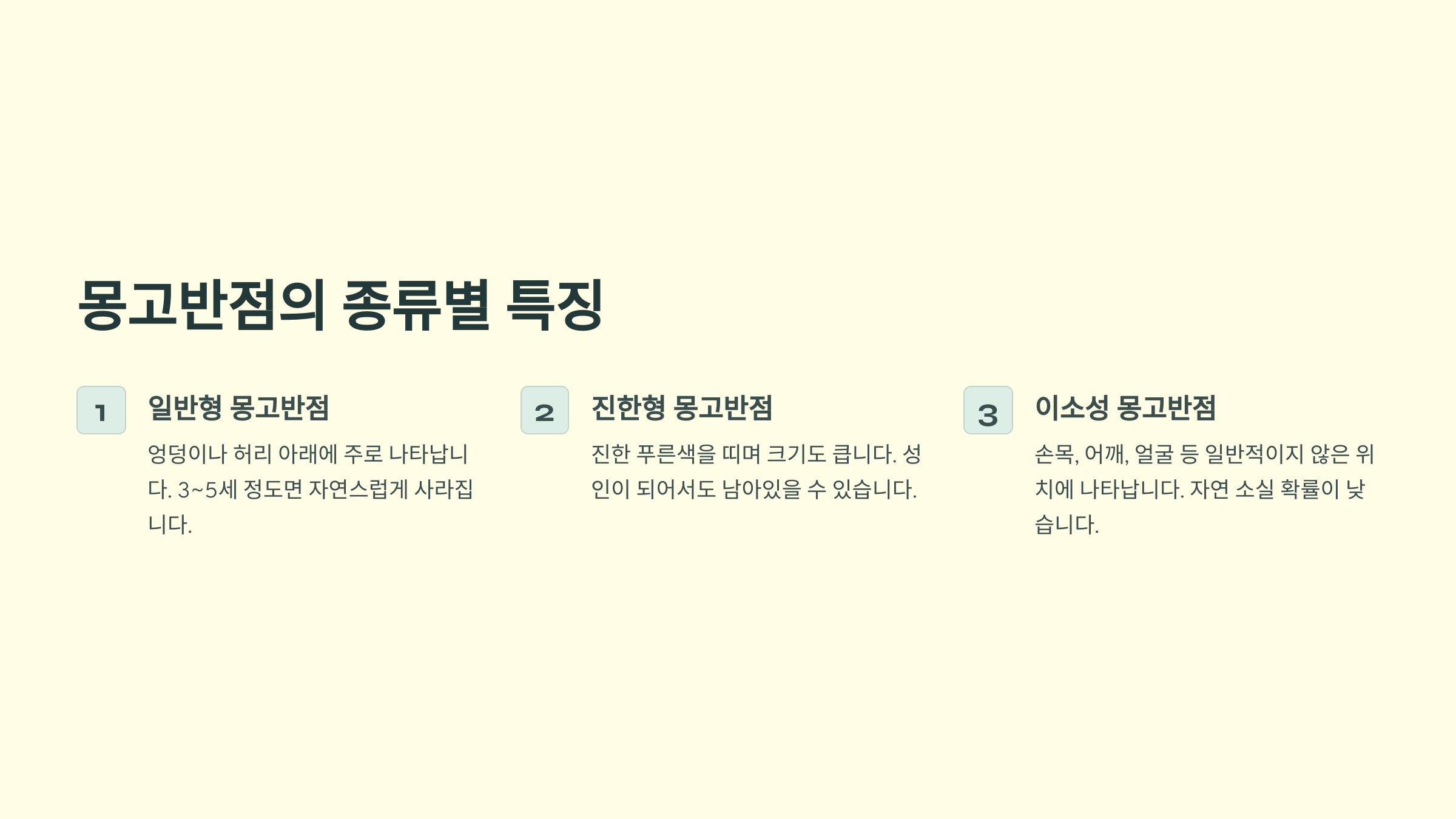 몽고반점은 크게 세 가지 종류로 나뉘어요. 각각의 특징을 알아두시면 우리 아이의 몽고반점이 어떤 타입인지 파악하는 데 도움이 될 거예요.