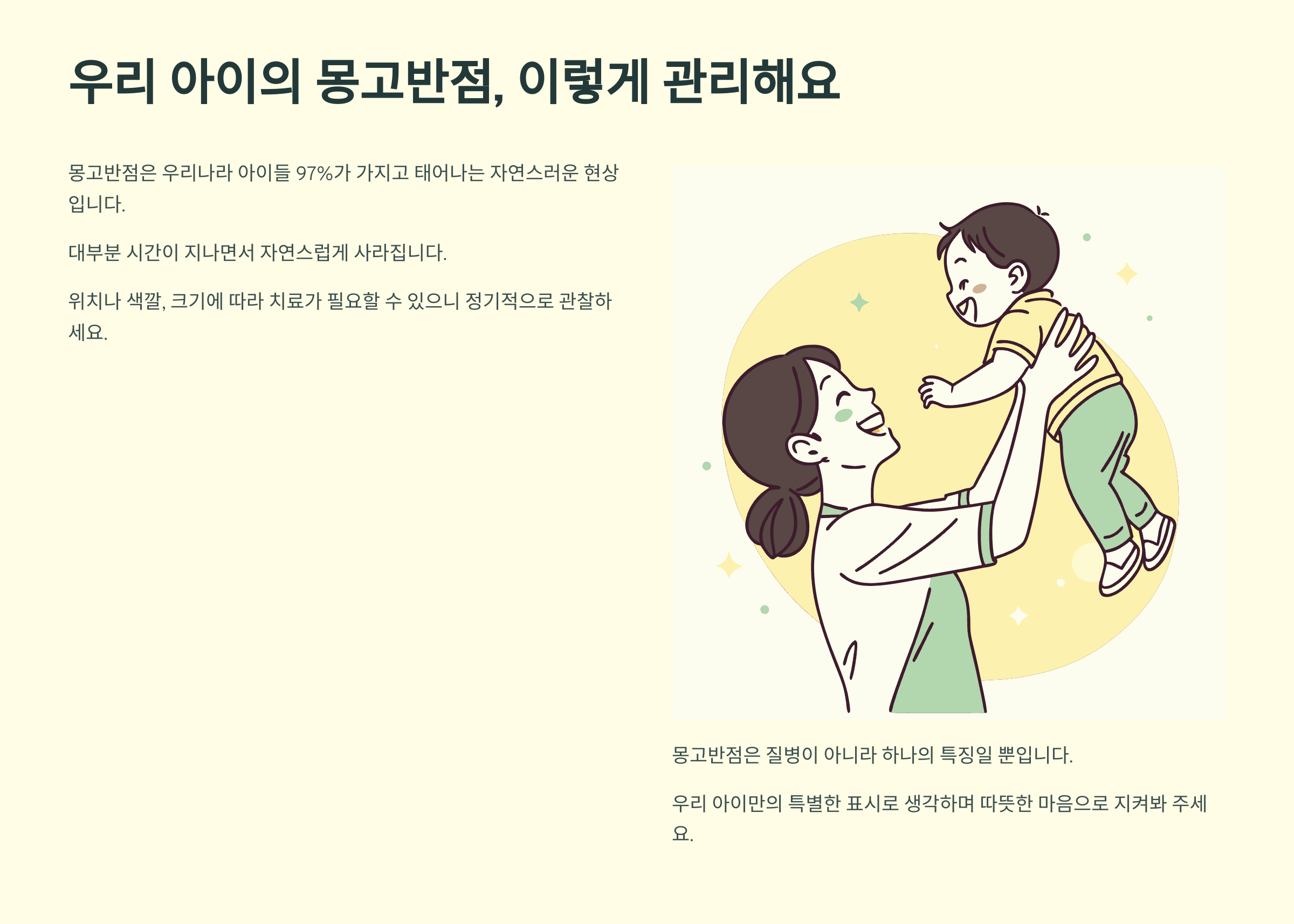 무엇보다 몽고반점은 질병이 아니라 하나의 특징일 뿐이라는 점을 잊지 마세요. 우리 아이만의 특별한 표시로 생각하시면서 따뜻한 마음으로 지켜봐 주시길 바랍니다.