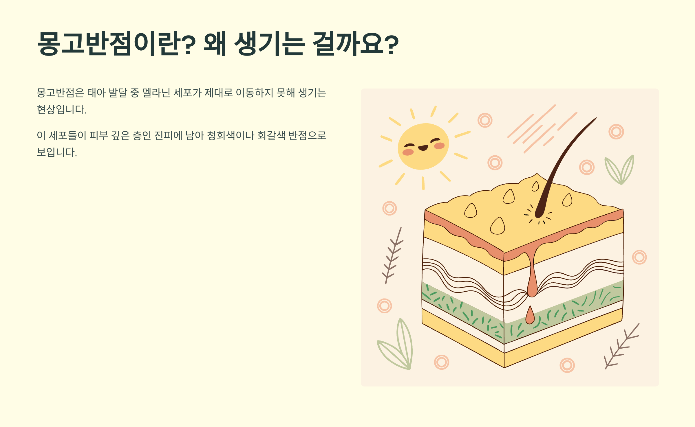 몽고반점은 태아가 엄마 배 속에서 자라는 동안 피부 색소를 만드는 멜라닌 세포들이 제대로 된 자리로 이동하지 못해 생기는 현상이에요. 본래 이 멜라닌 세포들은 피부 표면 가까이로 올라와야 하는데, 일부가 피부 깊은 층인 진피에 그대로 남아있게 되면서 청회색이나 회갈색의 반점으로 보이게 되는 거죠.
