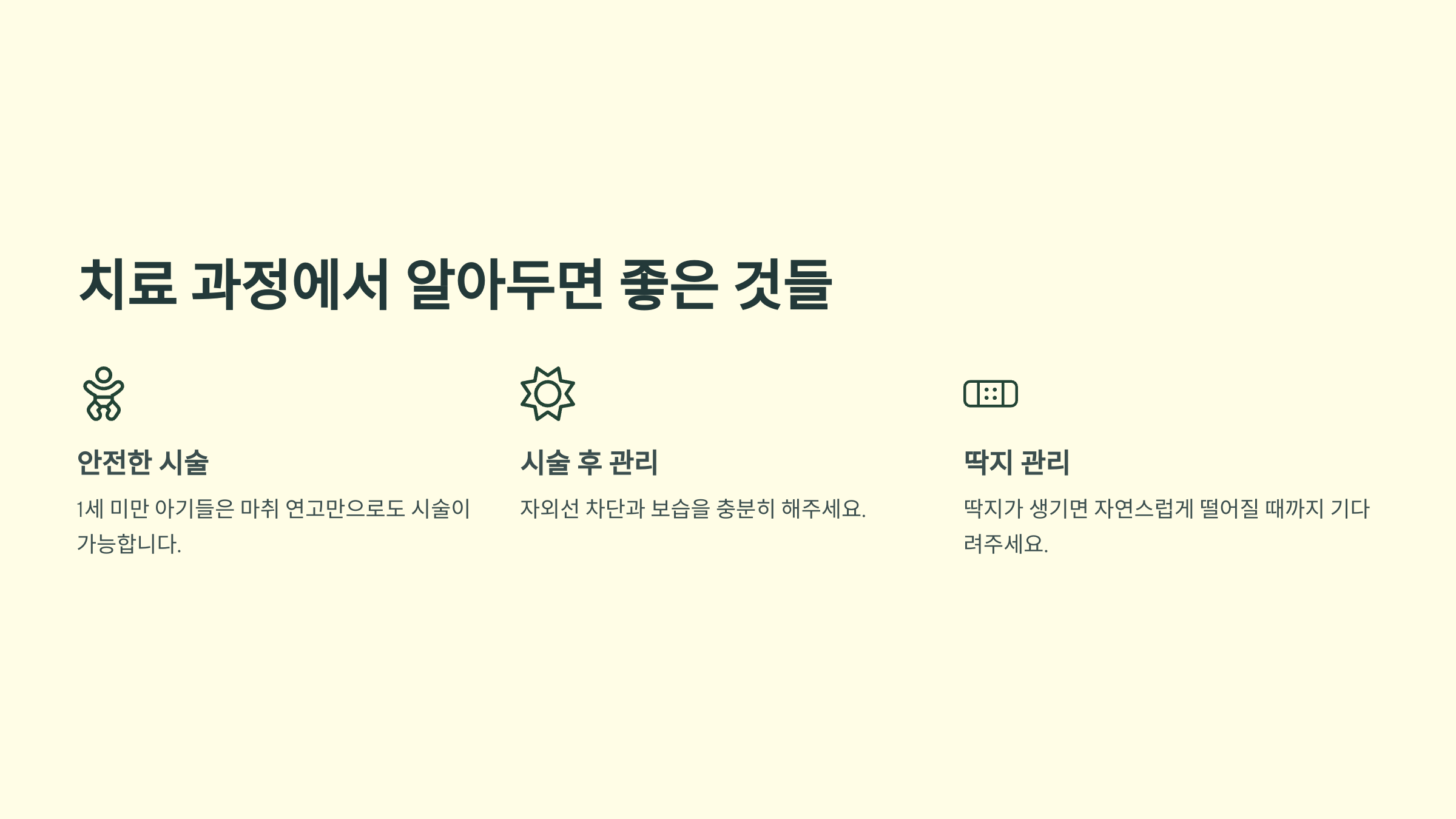 놀랍게도 만 1세 미만의 유아기에 치료를 시작하면 효과가 가장 좋아요. 이 시기에는 멜라닌 흡수량이 적어서 더 우수한 반응을 보이거든요. 1세 이후에도 치료는 가능하지만 횟수가 늘어나고 회복이 조금 더 오래 걸릴 수 있어요.