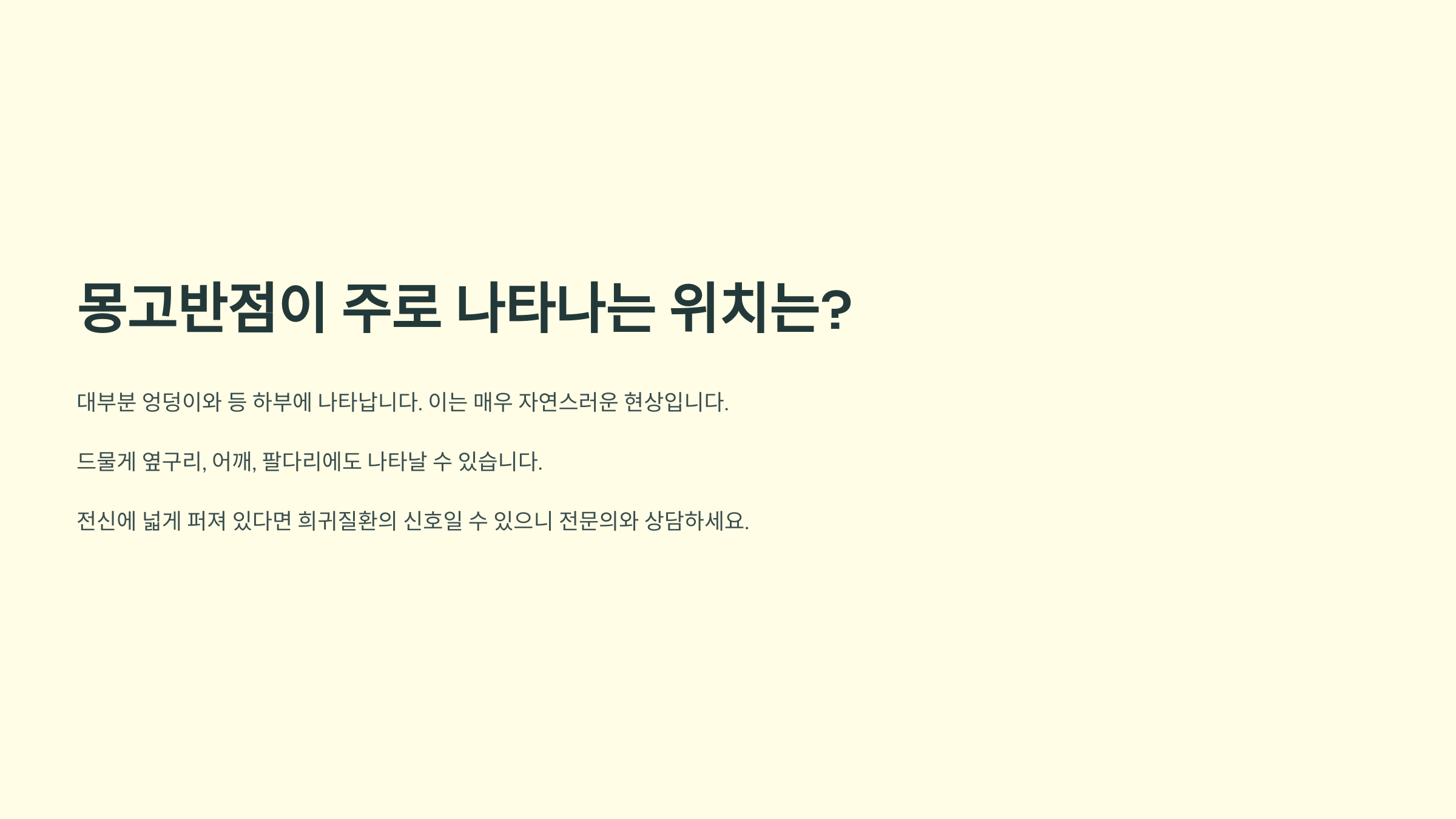 하지만 드물게 옆구리, 어깨, 팔다리, 손목, 발목 등에도 나타날 수 있어요. 만약 전신에 넓게 퍼져 있다면 헌터증후군 같은 희귀질환의 신호일 수도 있으니 전문의와 상담해보시는 것이 좋겠어요.