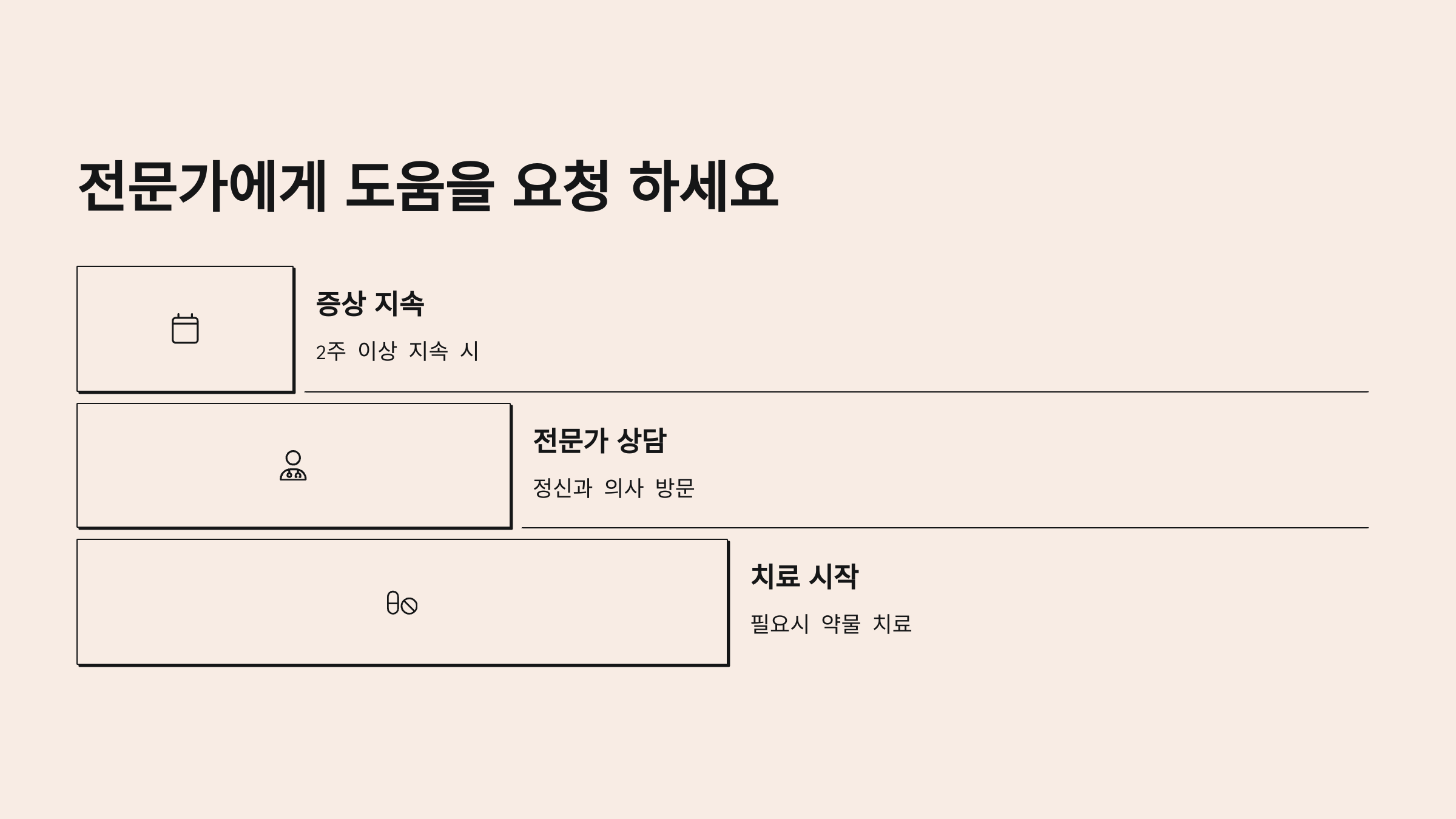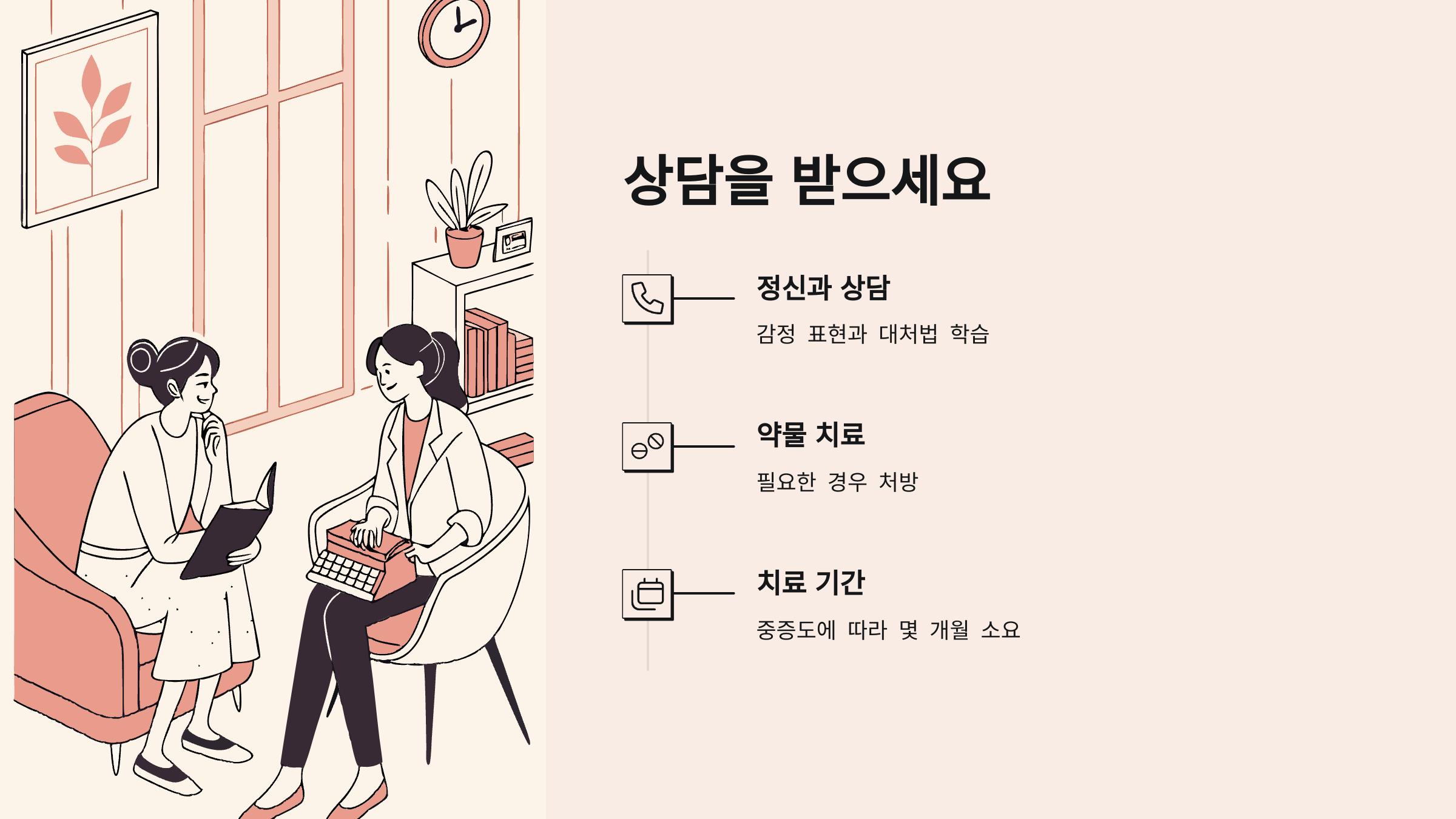 이 중 3-5개 이상에 해당된다면, 전문가의 상담을 받아보는 것이 좋습니다. 특히 이런 감정이 2주 이상 지속된다면 더욱 그렇죠.