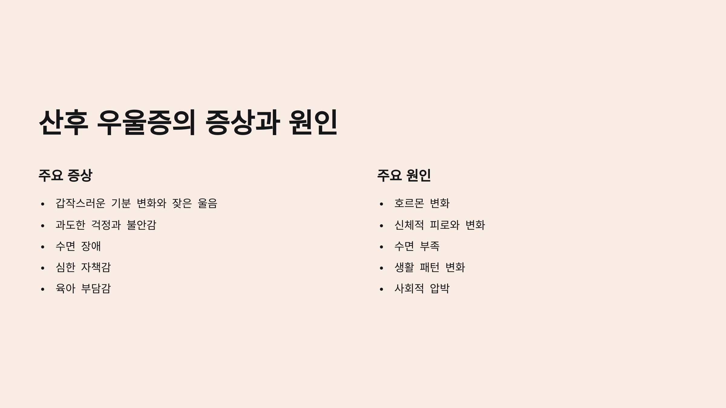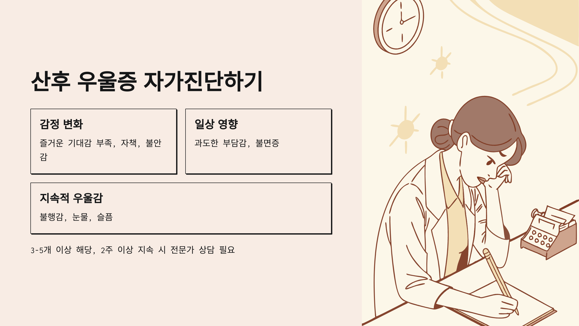 산후 우울증은 치료가 가능하고 극복할 수 있는 상태라는 점을 먼저 말씀드리고 싶어요. 이 글에서는 산후 우울증의 증상부터 자가진단, 그리고 효과적인 극복 방법까지 자세히 알아보겠습니다. 산모뿐만 아니라 가족들도 함께 읽으면 좋을 정보들을 준비했으니, 끝까지 함께해주세요!