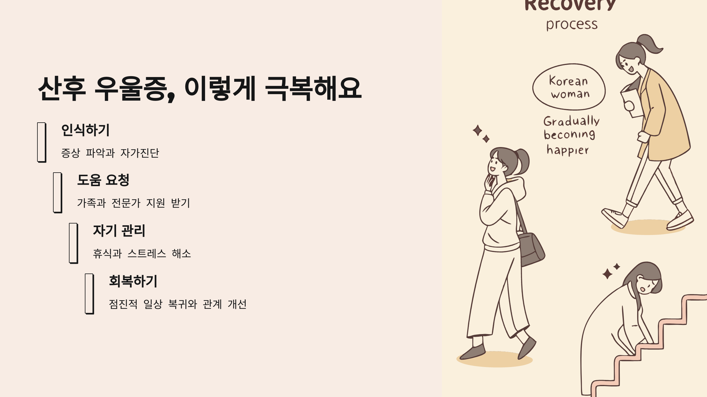 - 산후 우울증은 정신과 상담 및 필요한 경우 약물 치료로 호전될 수 있습니다