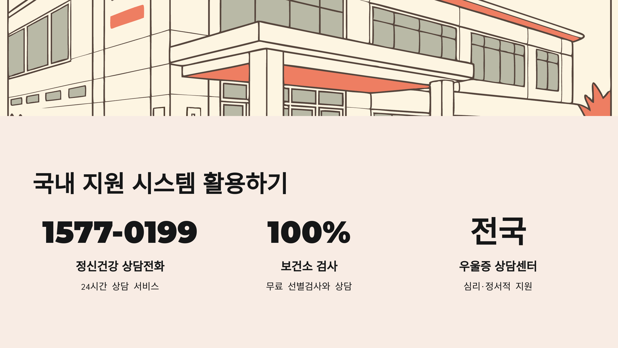 - 정신건강 상담 전화(1577-0199)를 통해 24시간 상담 서비스를 이용할 수 있습니다