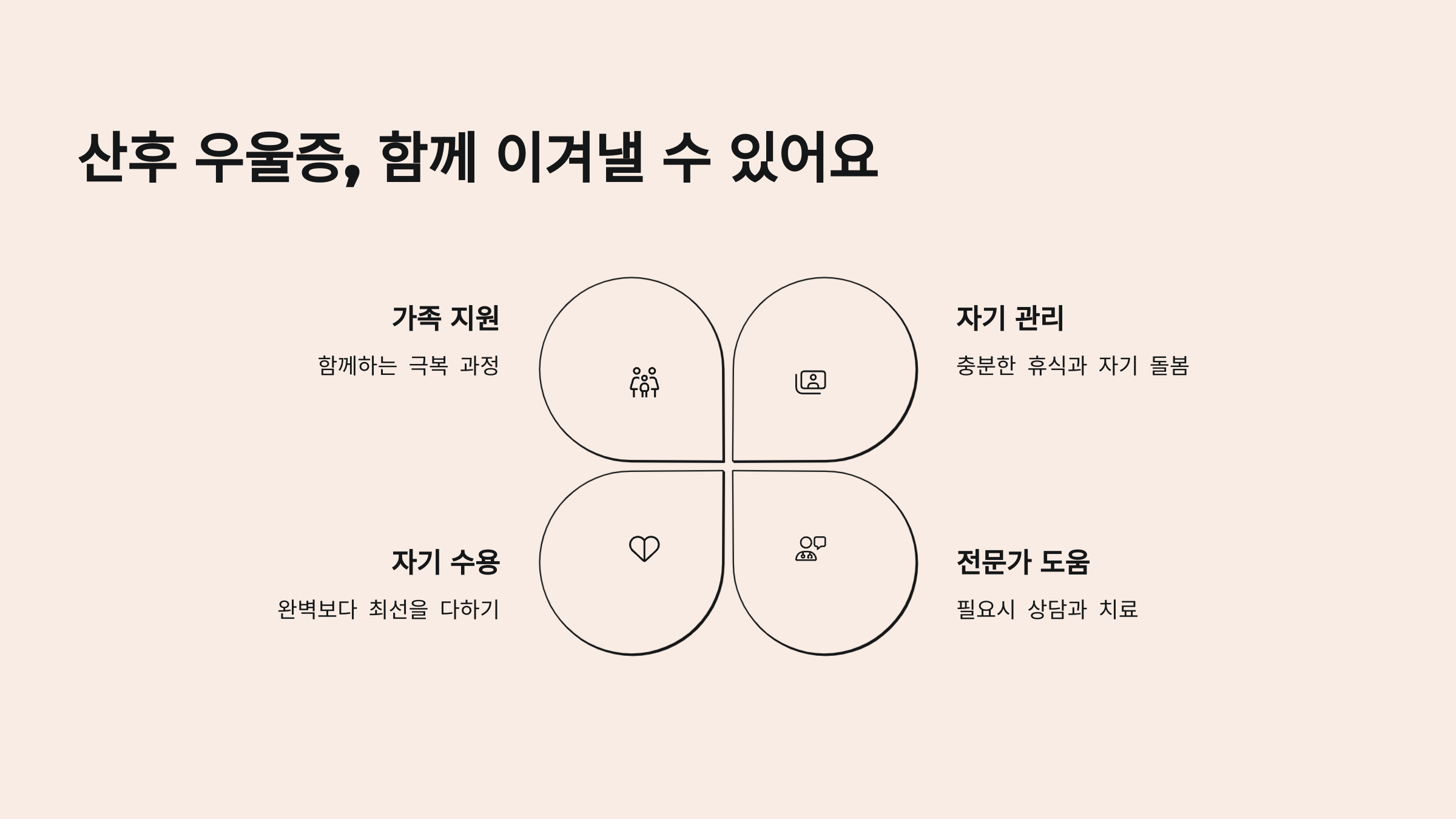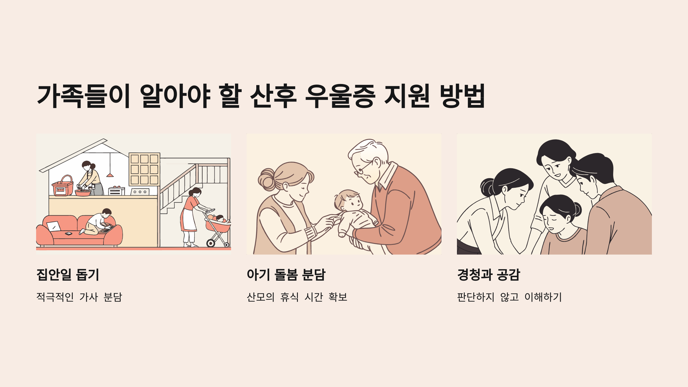 산후 우울증은 산모 혼자서 극복하기 어려운 문제입니다. 가족들의 이해와 지원이 필수적이에요.