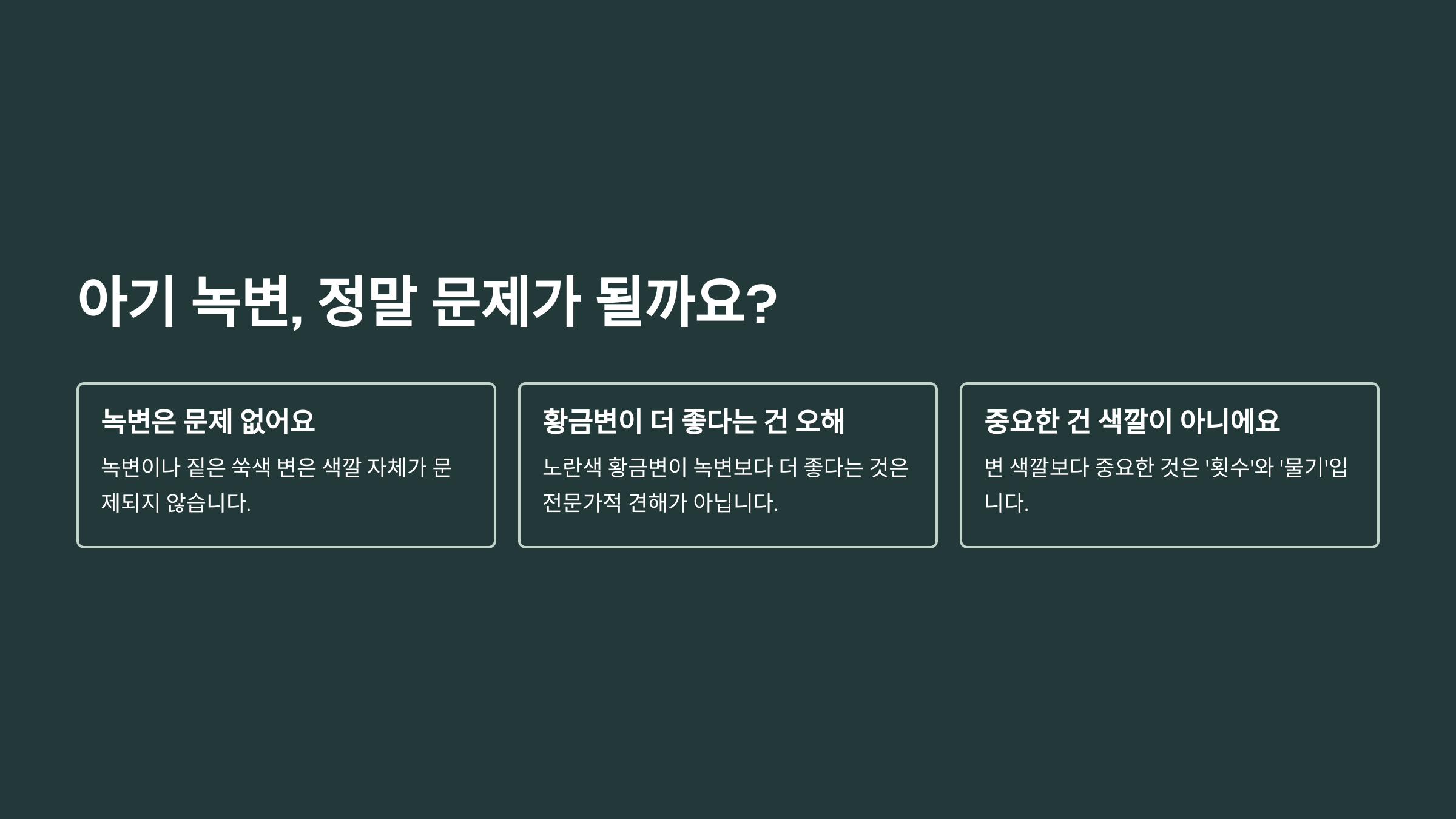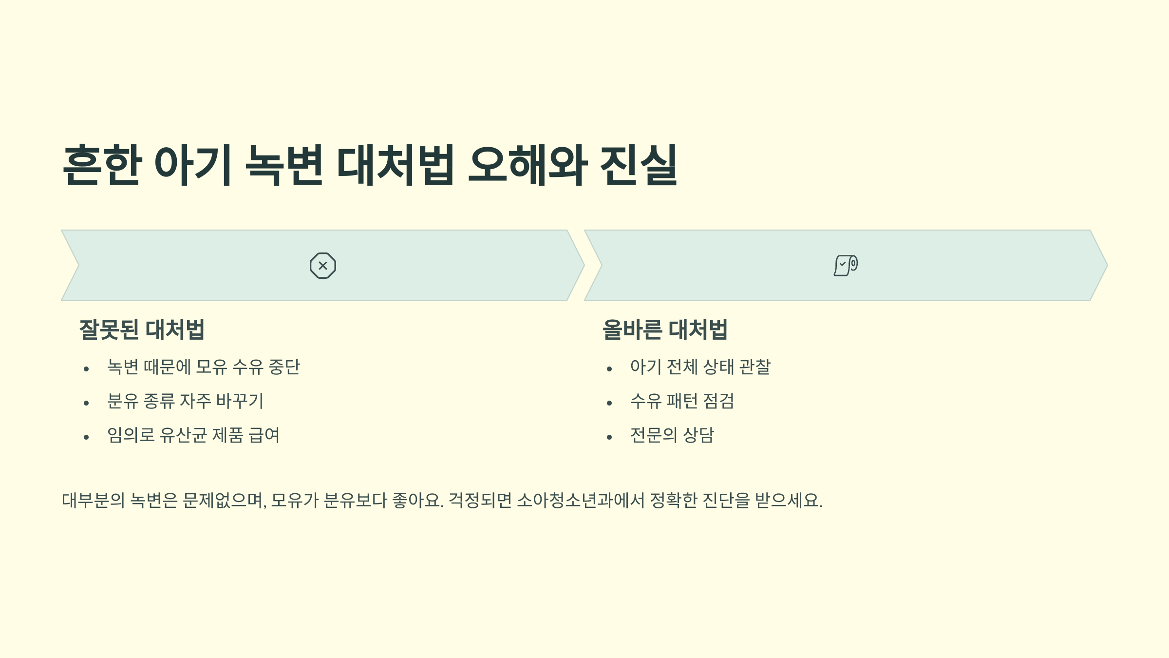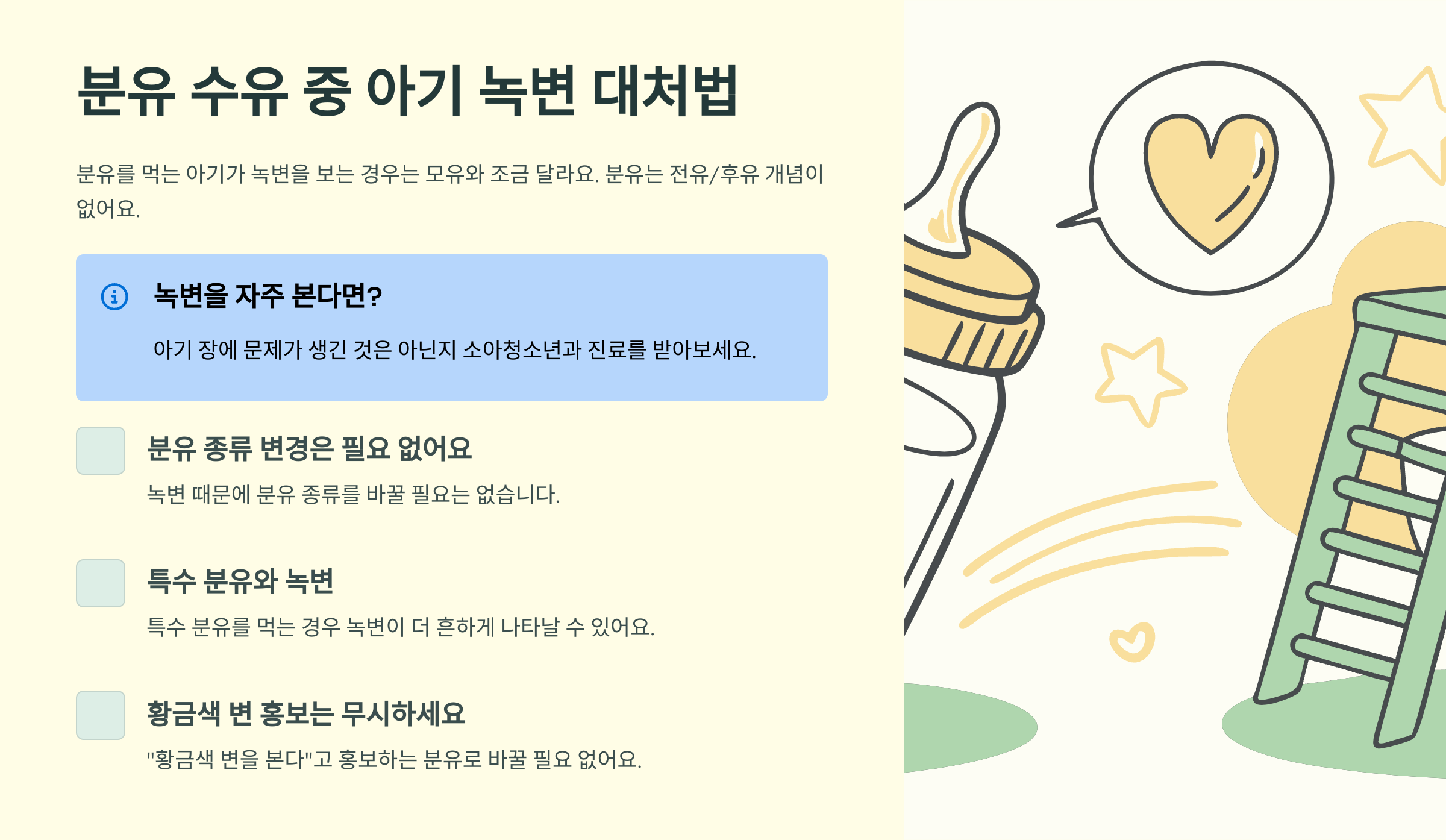 결론부터 말씀드리면, 녹변 그 자체는 전혀 문제가 되지 않아요! 많은 부모님들이 녹변을 보고 분유를 바꾸거나 모유 수유를 중단하는 경우가 있는데, 이는 잘못된 대처법이에요.
