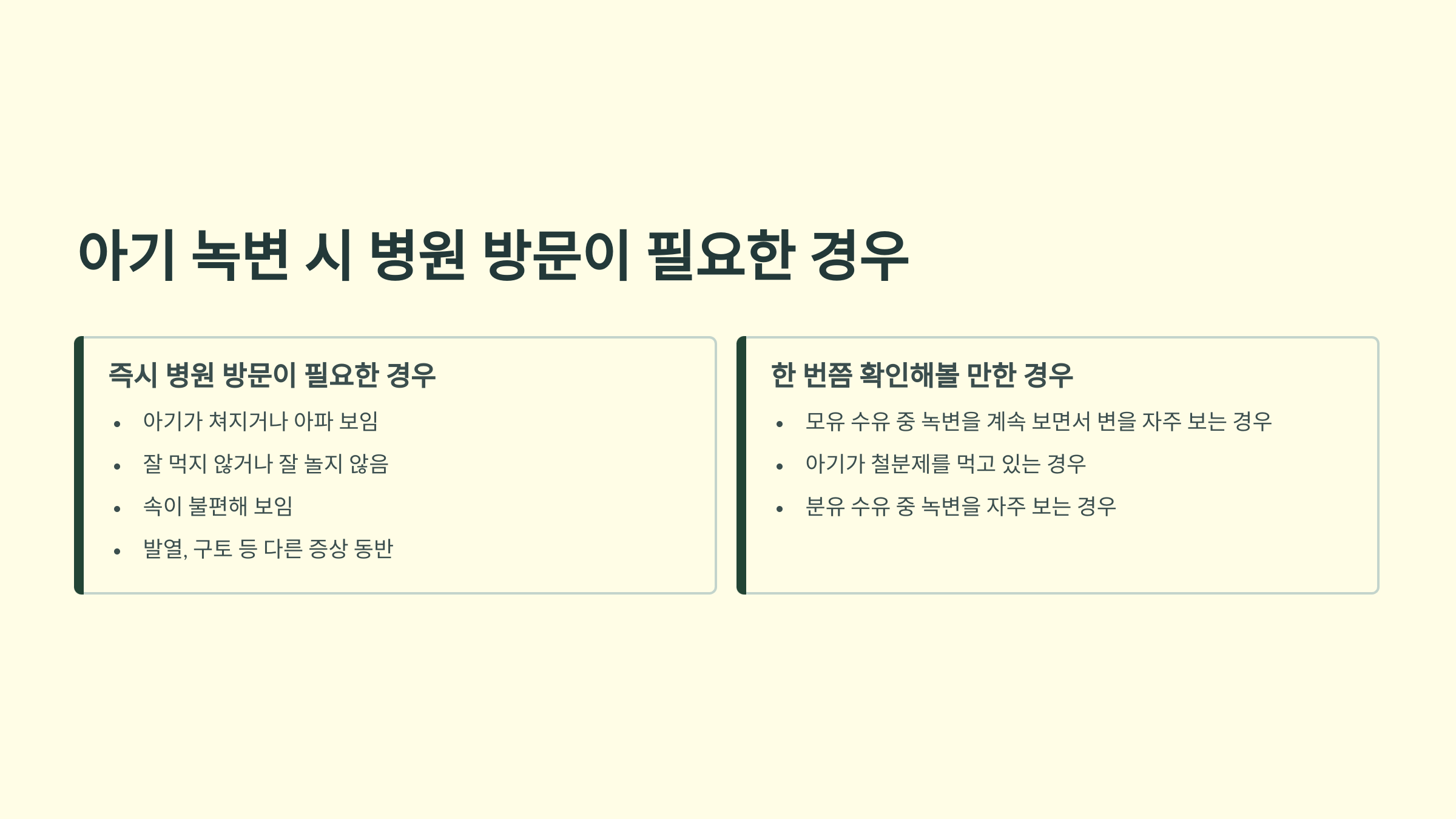 대부분의 녹변은 걱정할 필요가 없지만, 다음과 같은 경우에는 소아청소년과 진료를 받아보세요: