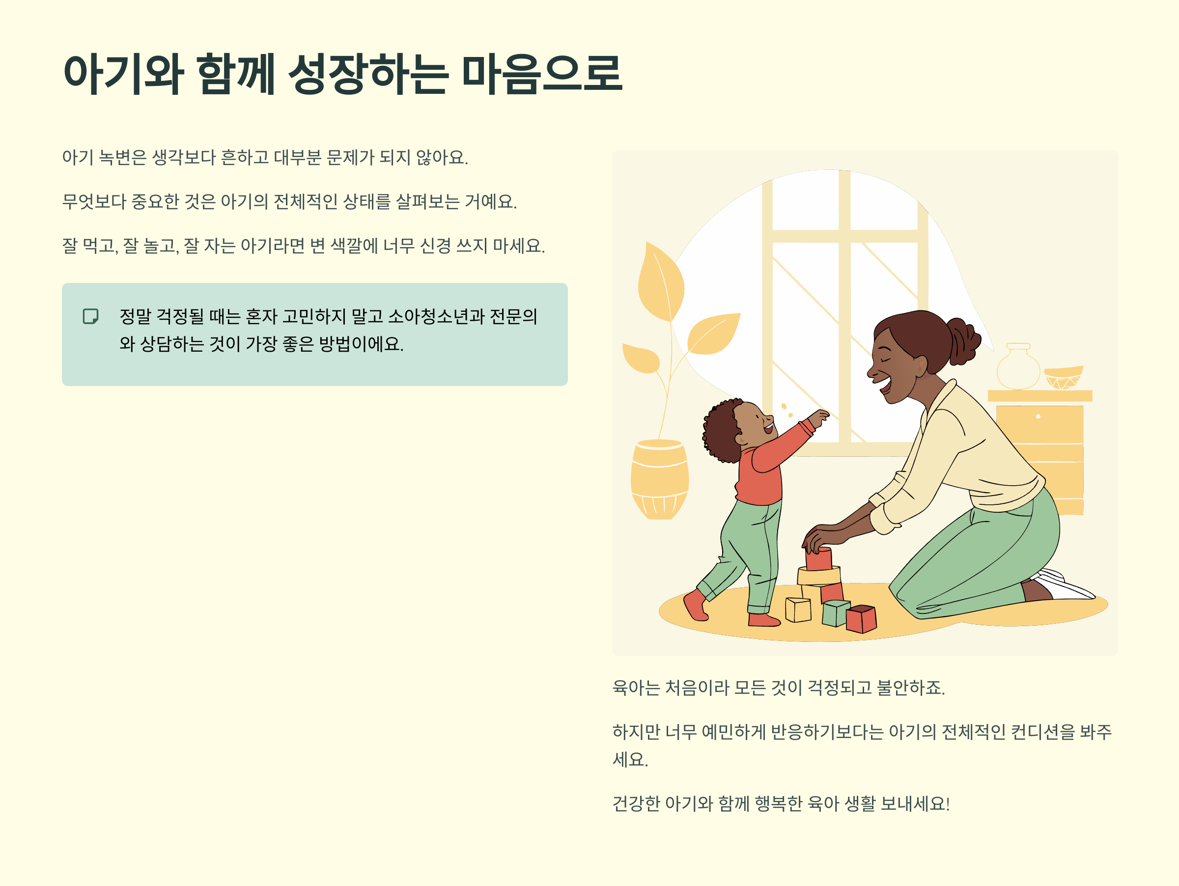 육아는 처음이라 모든 것이 걱정되고 불안하죠. 하지만 너무 예민하게 반응하기보다는 아기의 전체적인 컨디션을 봐주세요. 정말 걱정될 때는 혼자 고민하지 말고 소아청소년과 전문의와 상담하는 것이 가장 좋은 방법이에요.