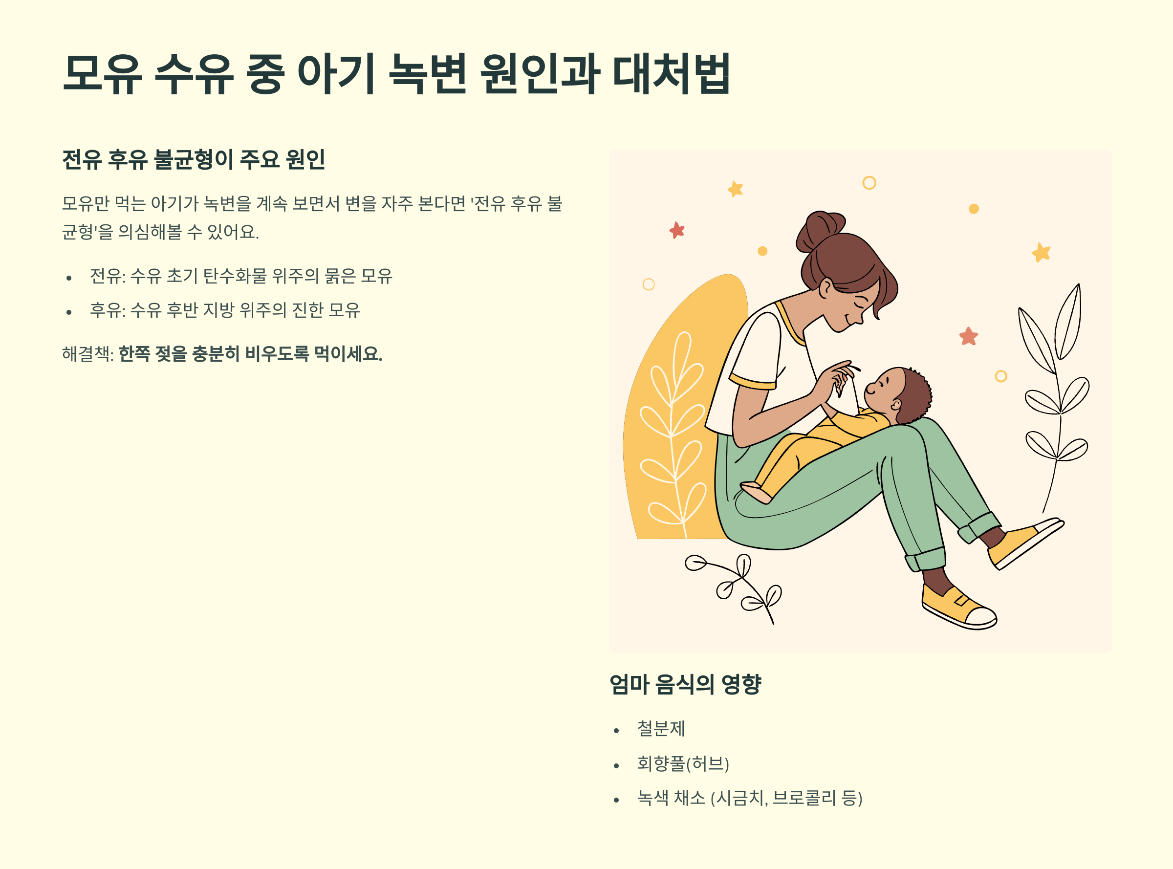 모유만 먹는 아기가 녹변을 계속 보면서 변을 자주 본다면 **'전유 후유 불균형'**을 의심해볼 수 있어요.