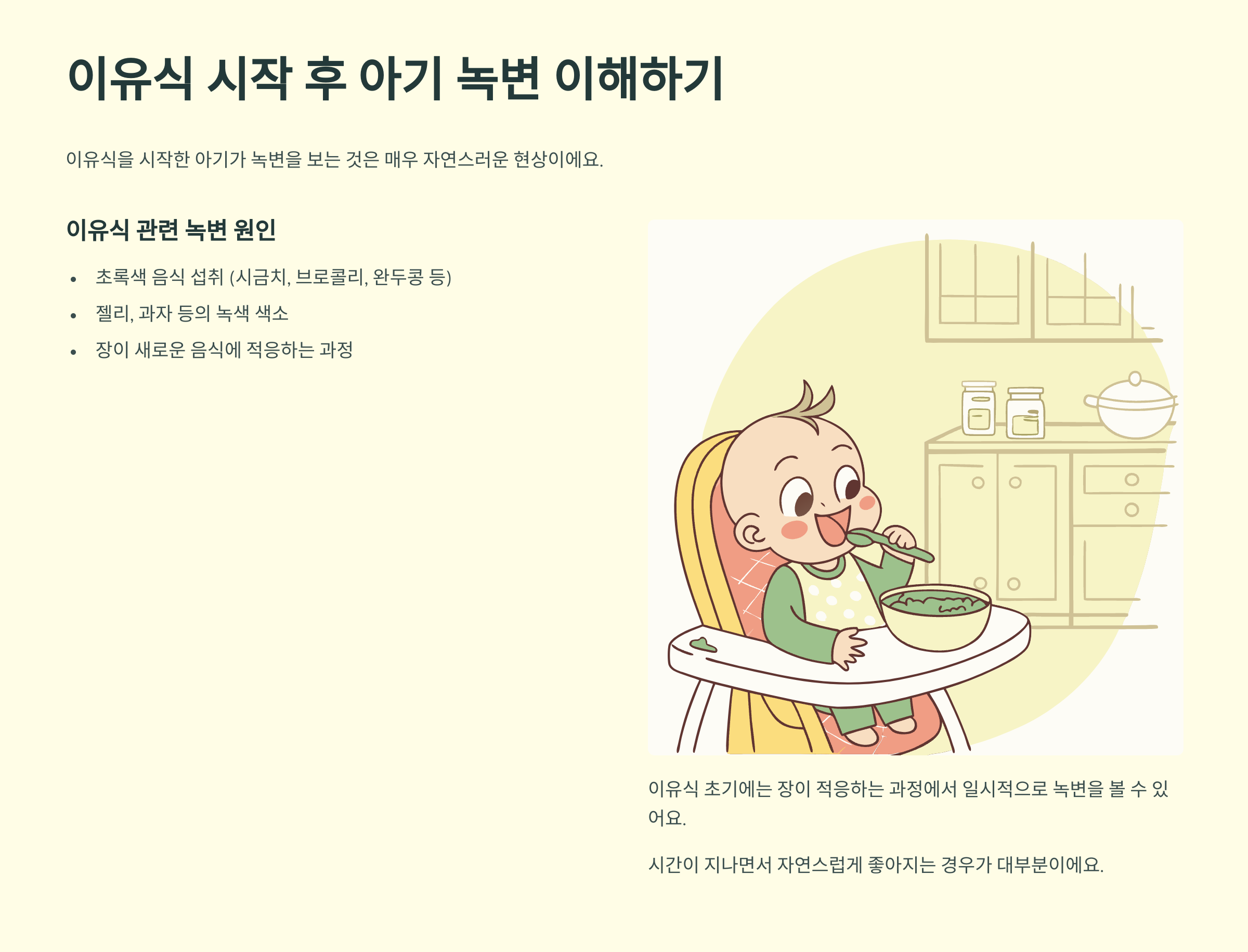 이유식 초기에는 장이 적응하는 과정에서 일시적으로 녹변을 볼 수 있어요. 시간이 지나면서 자연스럽게 좋아지는 경우가 대부분이에요.