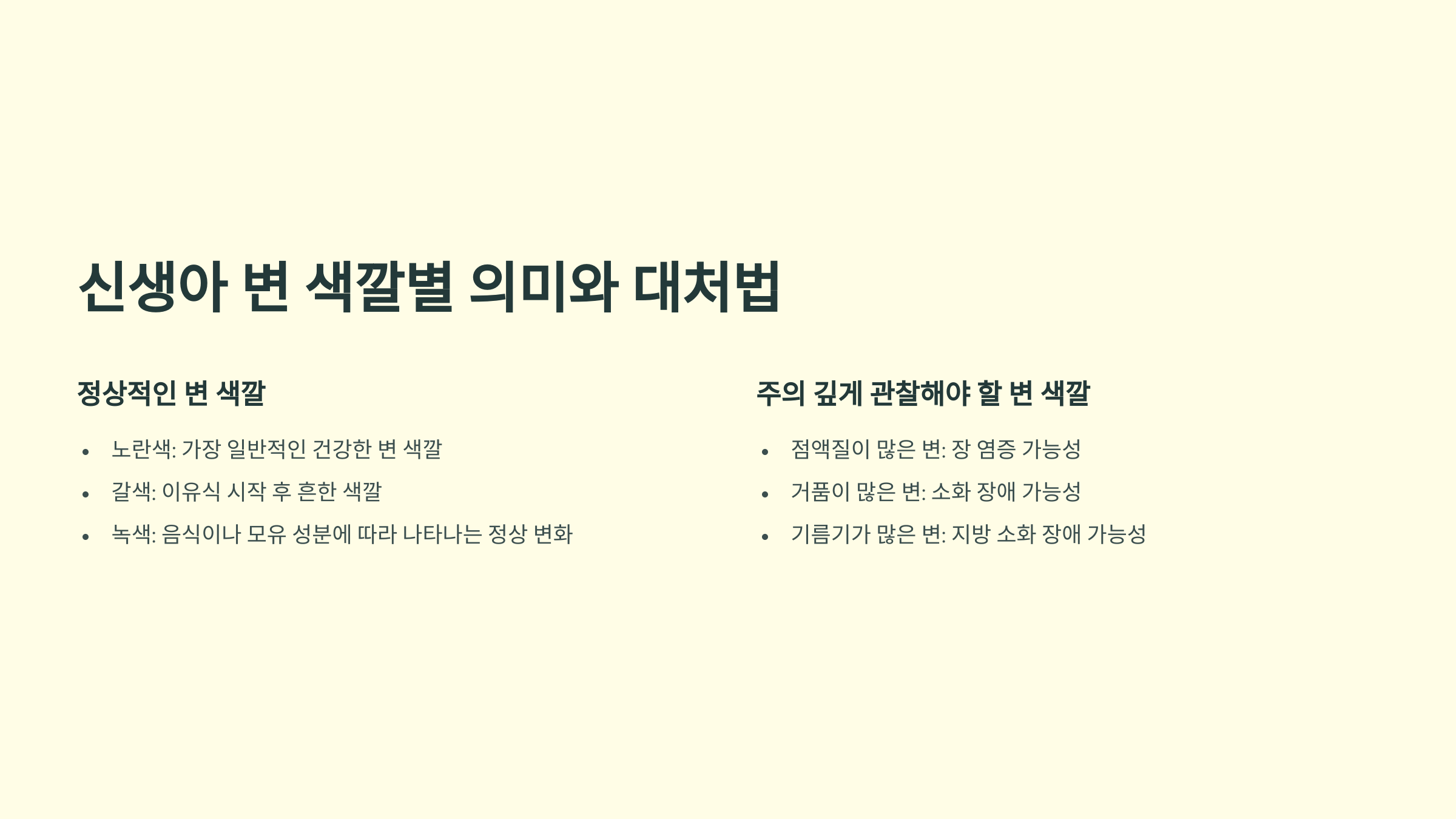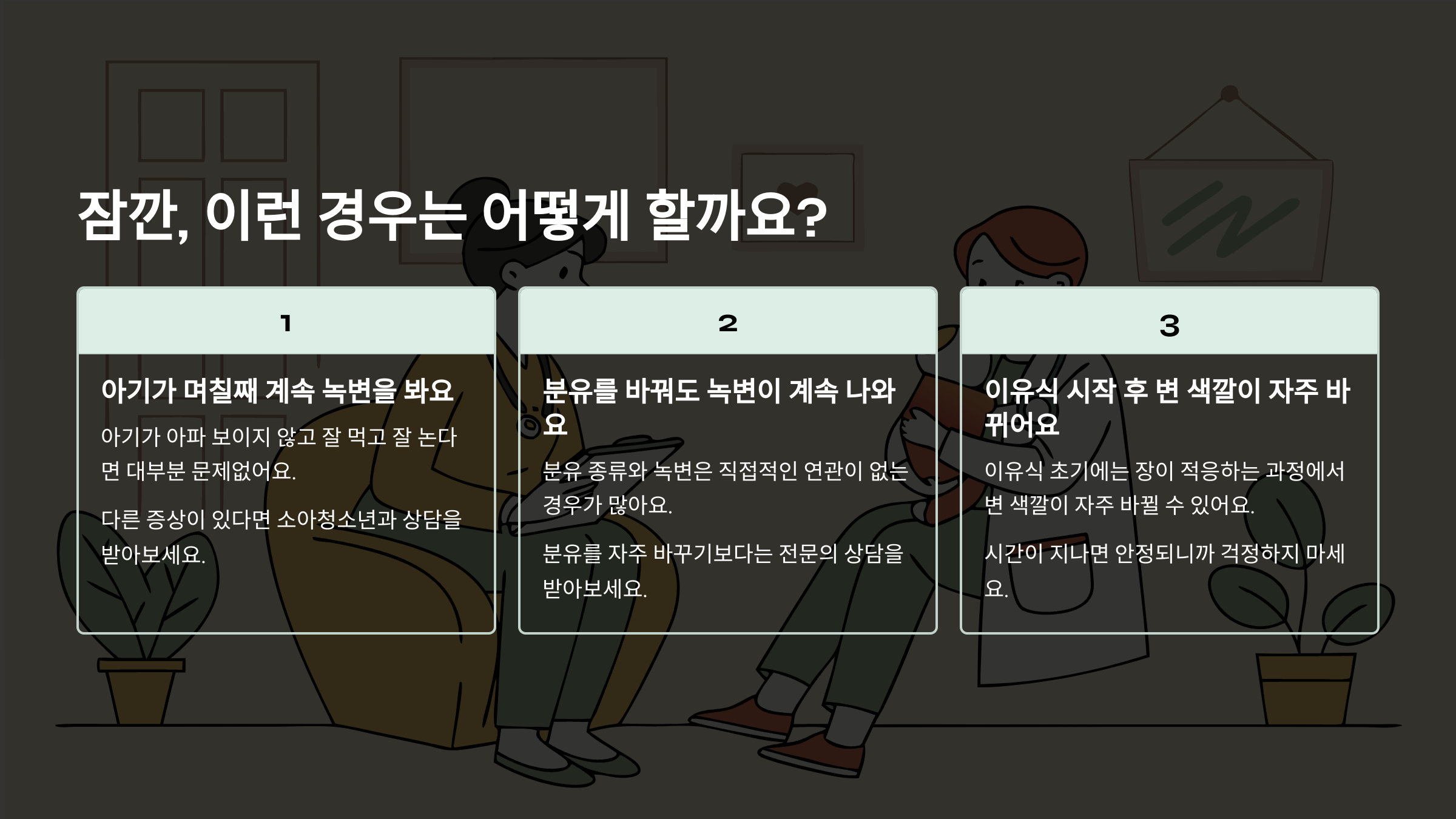 - 아기 전체 상태 관찰: 변 색깔보다 아기가 잘 먹고 잘 노는지 확인