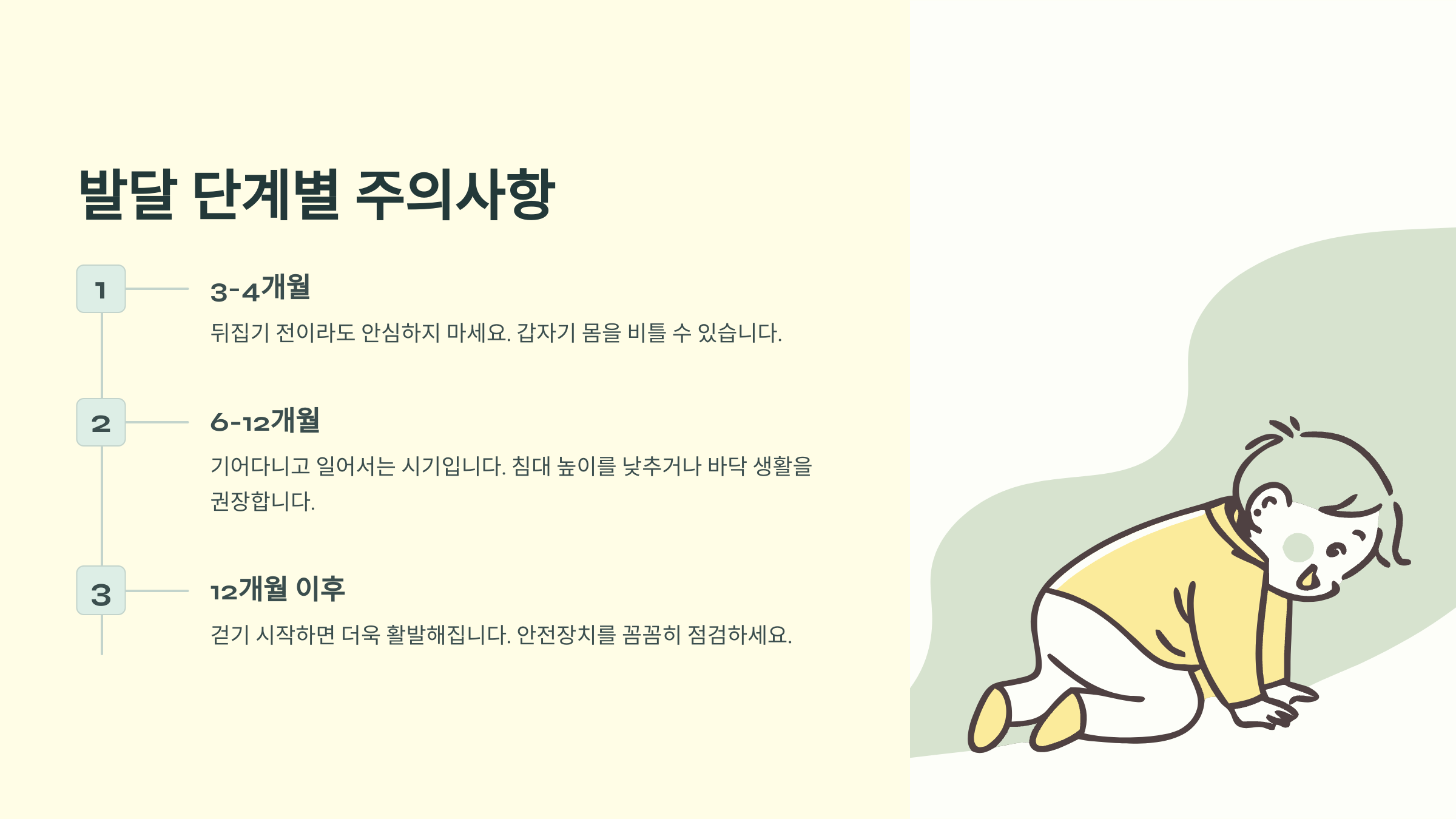 생후 6-12개월: 기어 다니고 잡고 일어서는 시기라 특히 주의가 필요해요. 침대 높이를 낮추거나 바닥 생활을 권장해요.