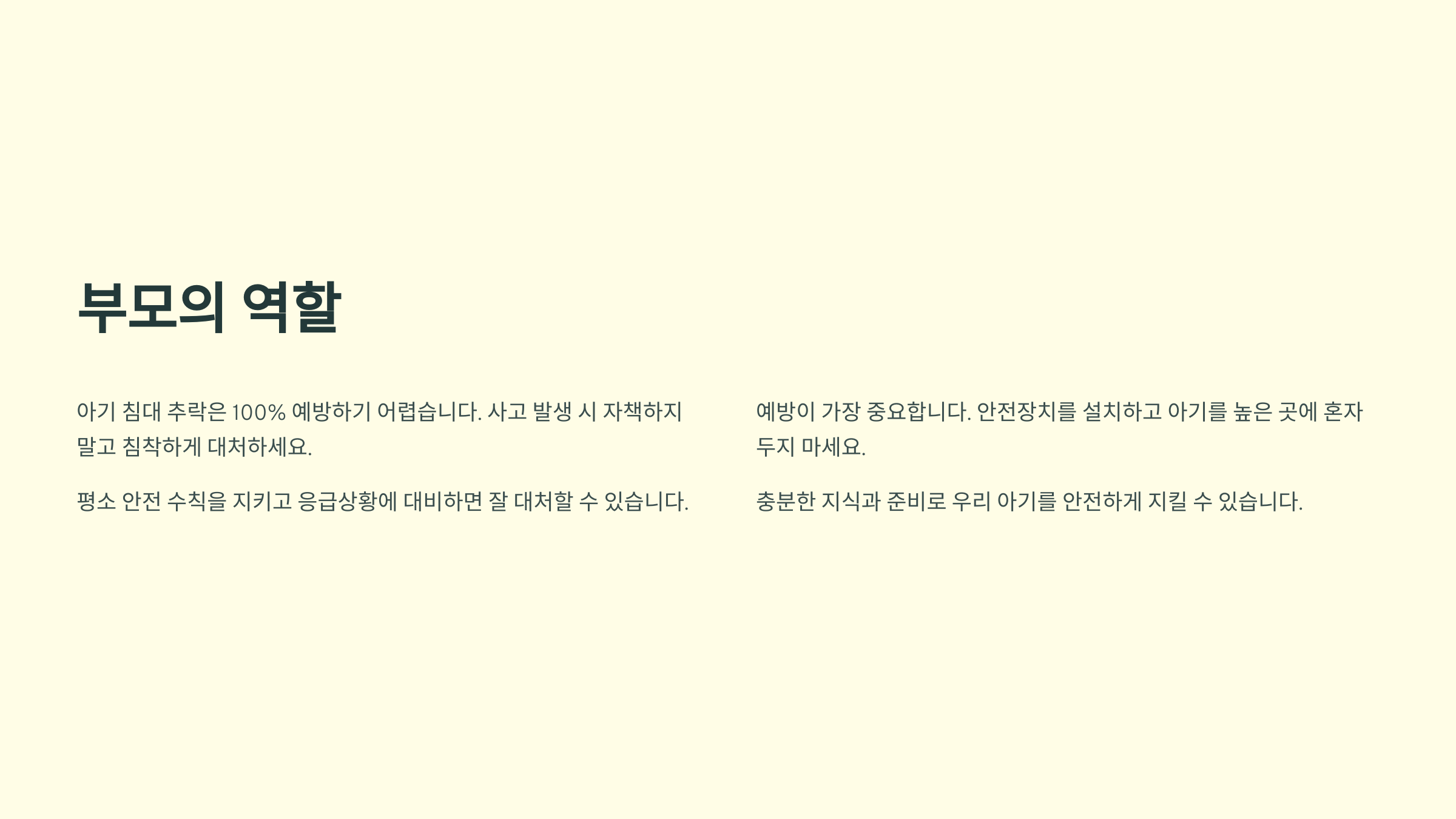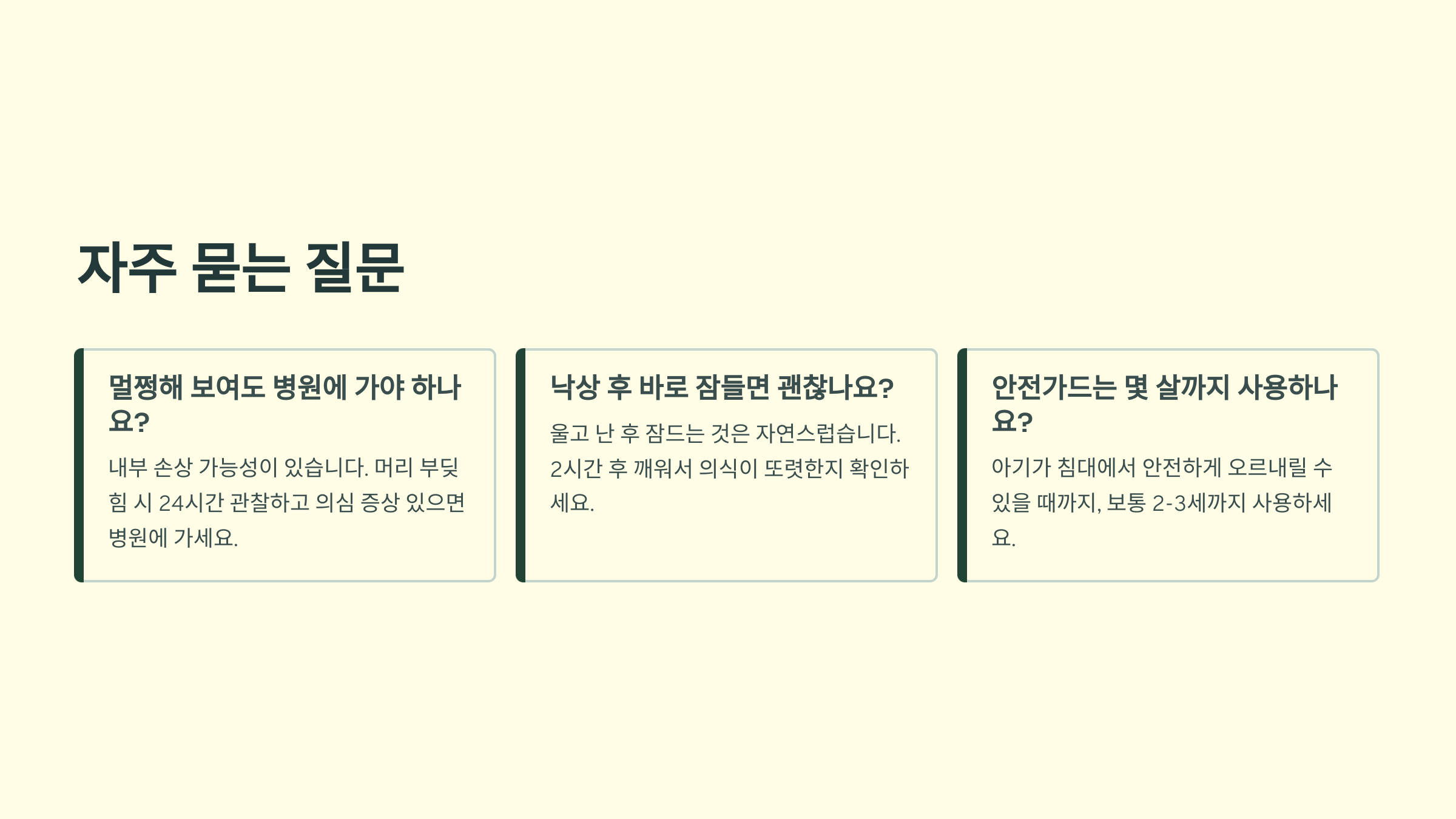 아기 침대 추락 사고는 아무리 조심해도 100% 예방하기 어려운 일이에요. 사고가 발생했을 때 자책하지 말고 침착하게 대처하는 것이 중요해요. 평소에 안전 수칙을 잘 지키고, 응급상황에 대비한 준비를 해두면 충분히 잘 대처할 수 있어요.