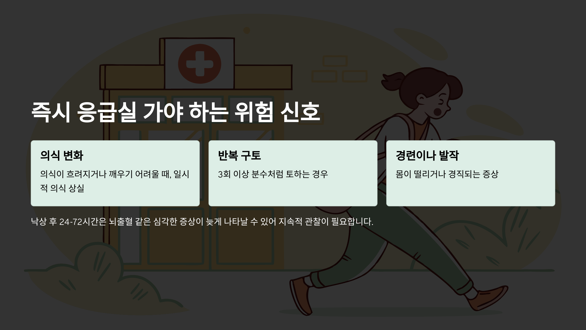 특히 침대 추락 후 24시간에서 72시간까지는 뇌출혈 같은 심각한 증상이 늦게 나타날 수 있어서 지속적인 관찰이 필요해요.