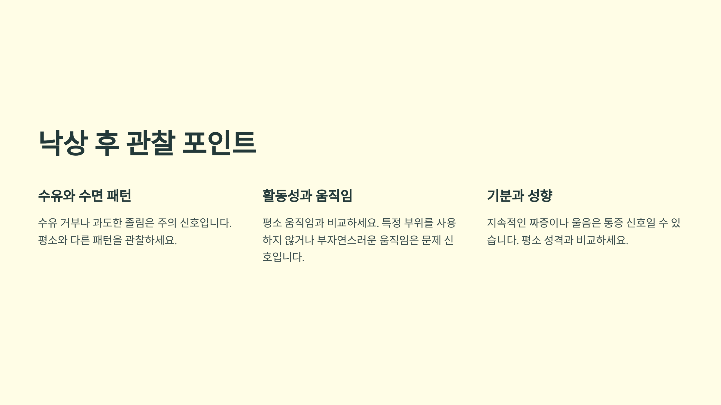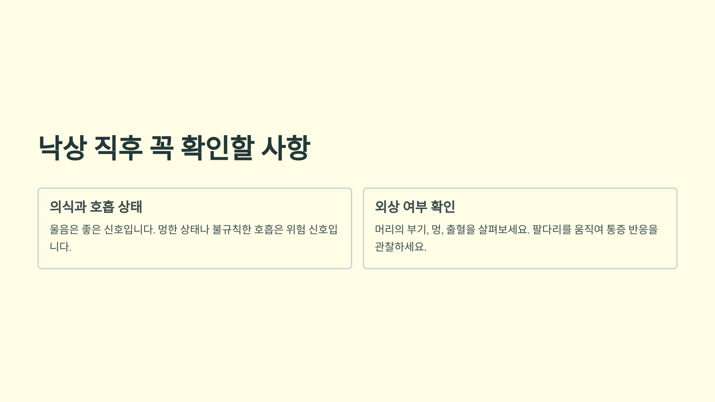 아기의 머리 부분을 먼저 살펴보세요. 부기나 멍, 출혈이 있는지 확인하고, 팔과 다리도 천천히 움직여보면서 통증 반응이나 비정상적인 자세를 보이는지 관찰해주세요.